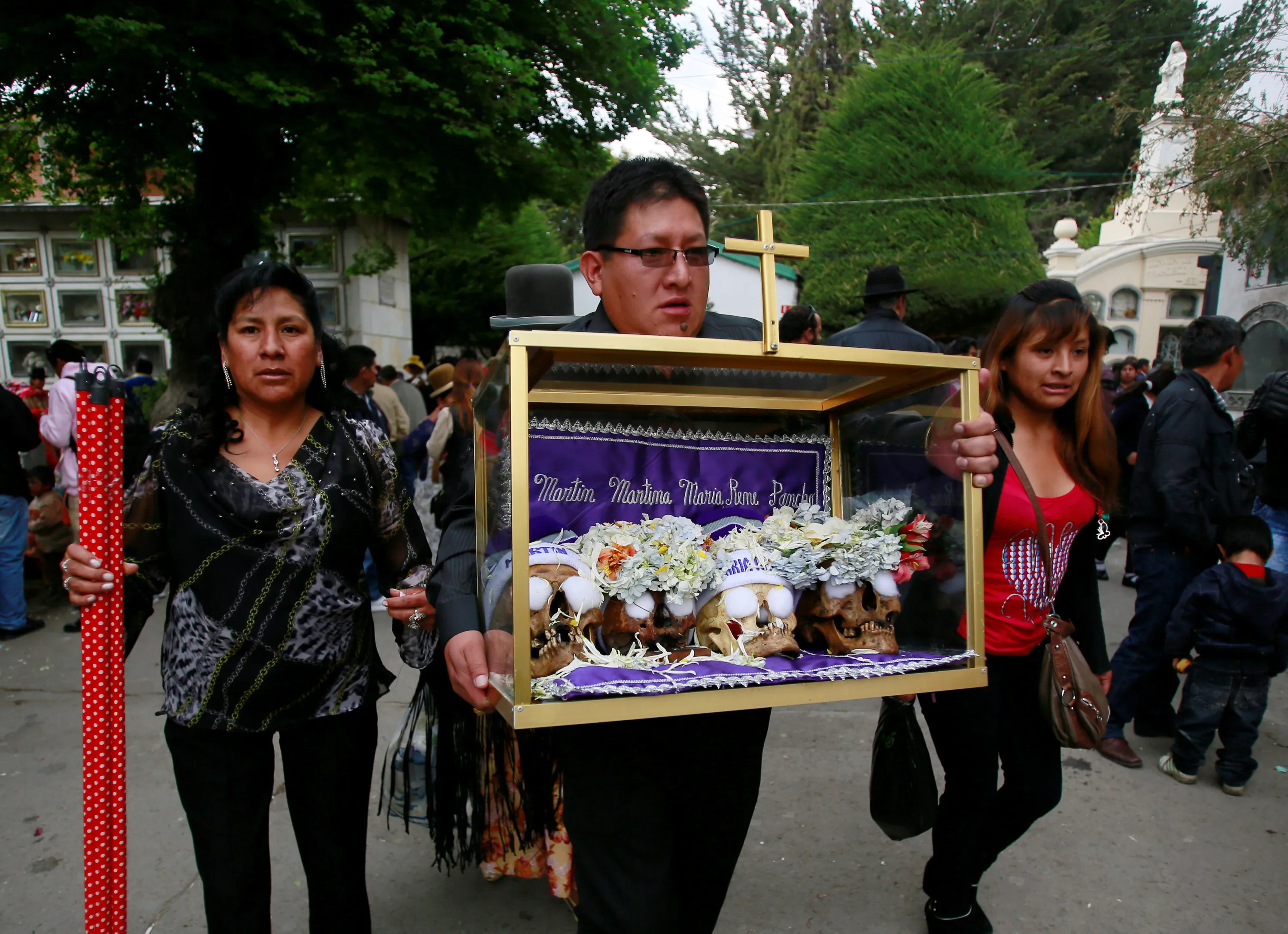 Devotes with skulls arrive for a mass during the Day of Skulls in La Paz, Bolivia, November 8, 2016. (Photo by David Mercado/Reuters)