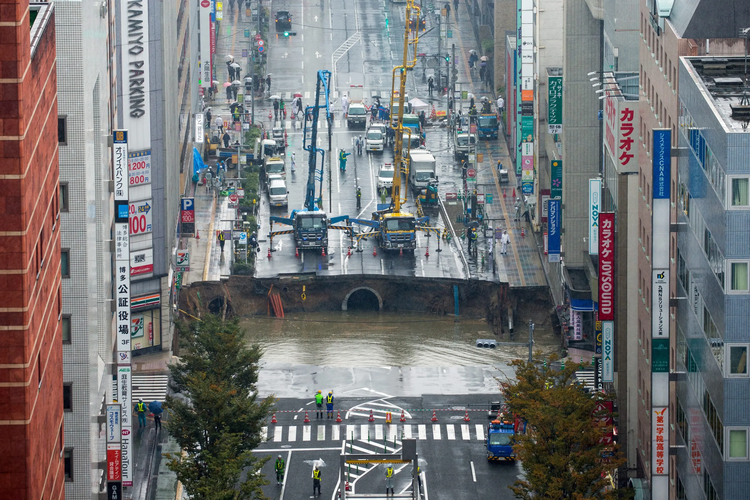 A large sinkhole cuts off an avenue in central Fukuoka, southwestern Japan, 08 November 2016. According to local media reports, the sinkhole has caused blackouts and disrupted traffic. Authorities have evacuated surrounding buildings in case of further damage. There were no immediate reports of damage or injuries. (Photo by Hiroshi Yamamura/EPA)