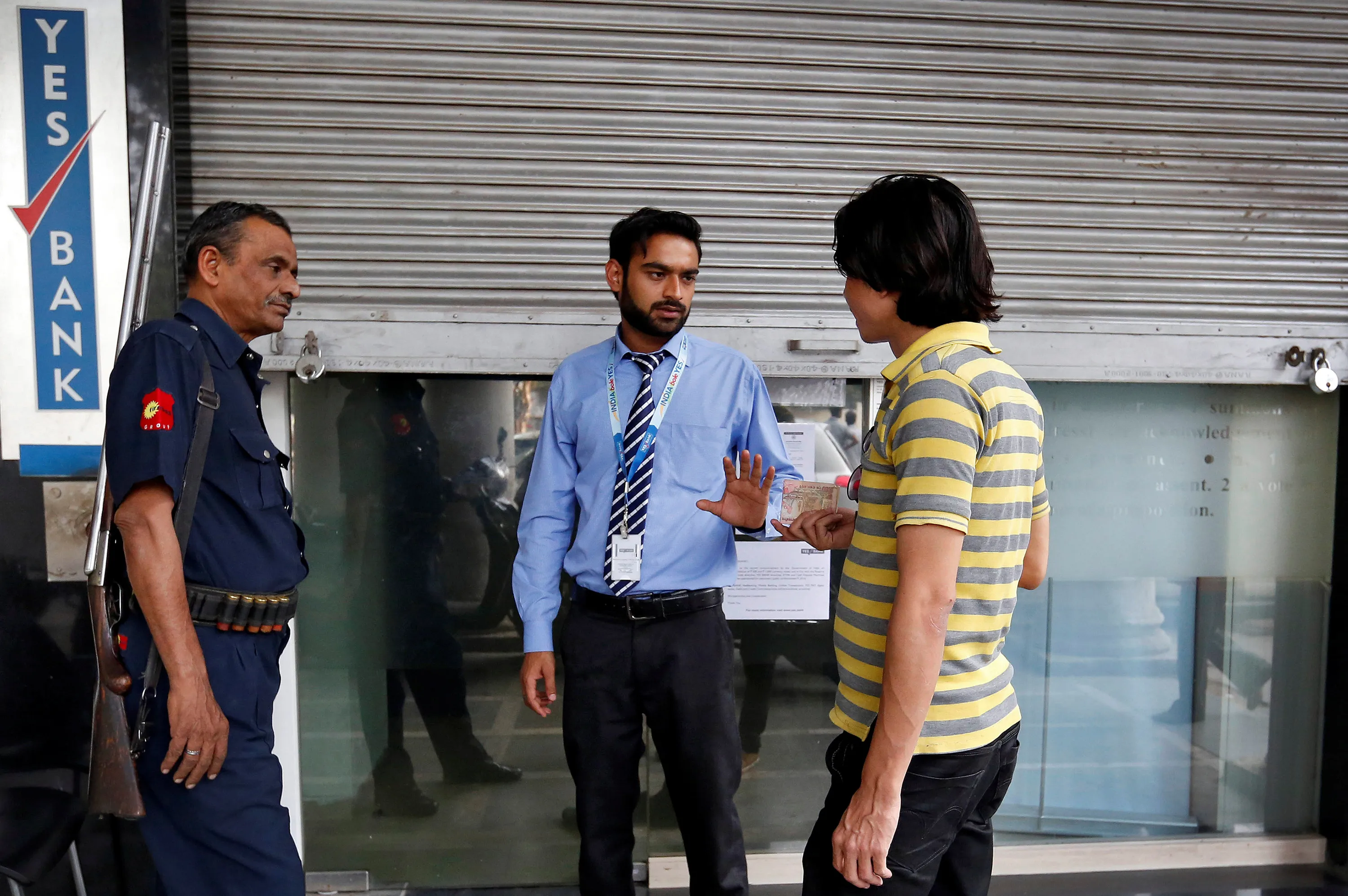 An employee speaks with a man holding 1000 rupee notes outside a Yes Bank branch in New Delhi, India, November 9, 2016. (Photo by Cathal McNaughton/Reuters)
