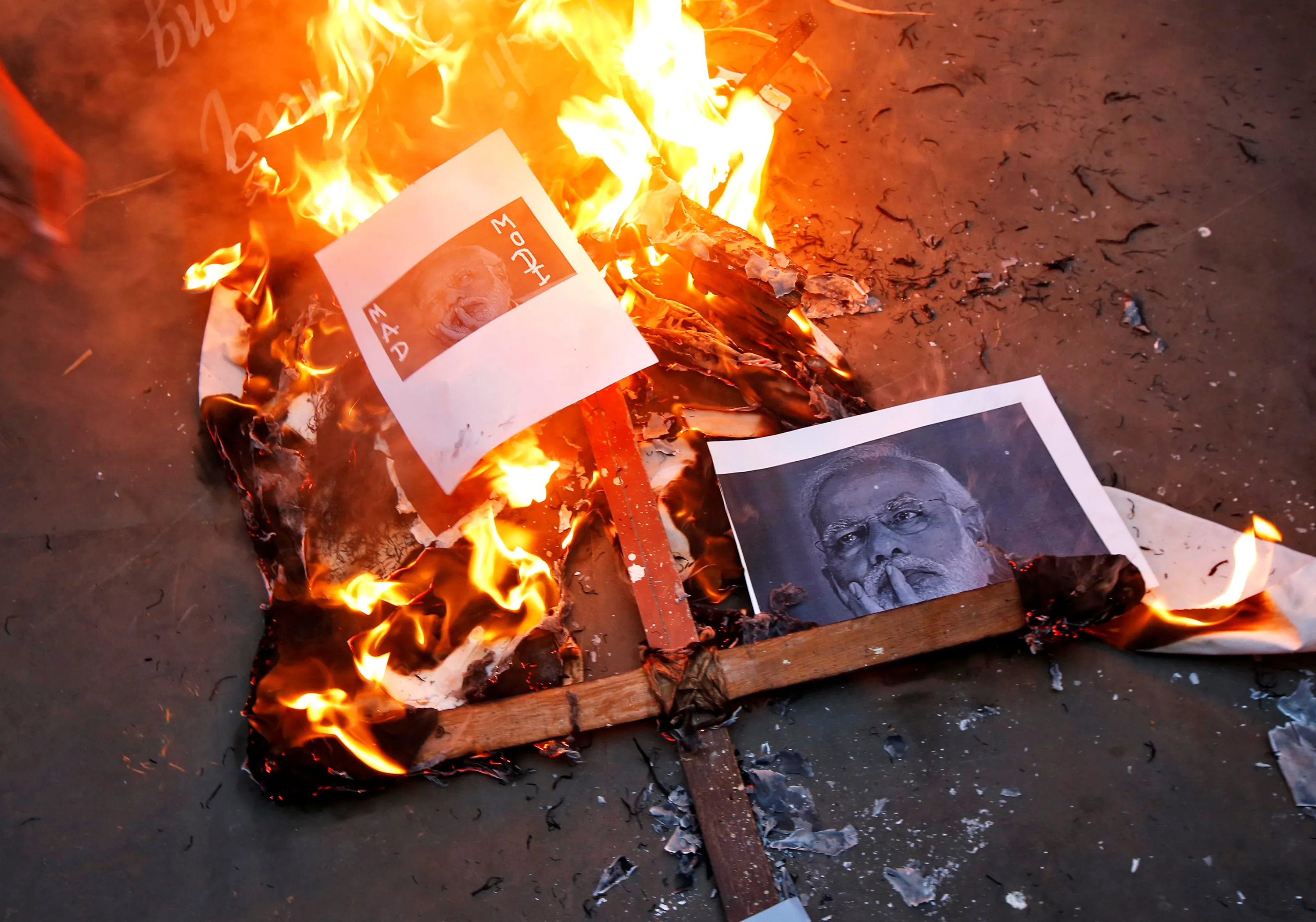 Indian Prime Minister Narendra Modi’s picture burns during a protest against the Indian government’s withdrawal of 500 and 1000 Indian rupee banknotes across India, in Kolkata, India, November 9, 2016. (Photo by Rupak De Chowdhuri/Reuters)