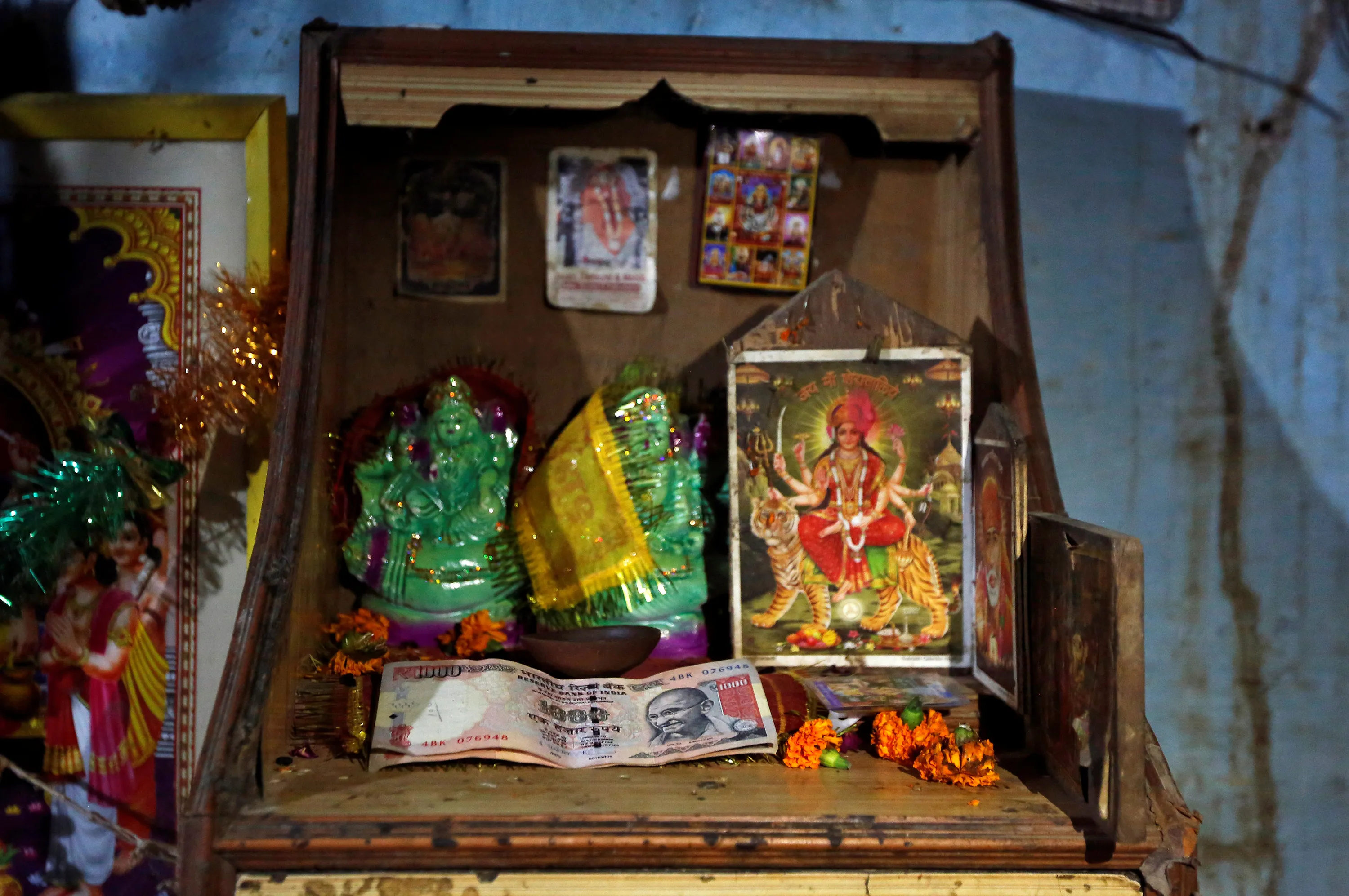 1000 Indian rupee banknotes are seen kept in front of idols and pictures of Hindu deities at a shop on the outskirts of northern city of Kanpur, India November 9, 2016. (Photo by Adnan Abidi/Reuters)