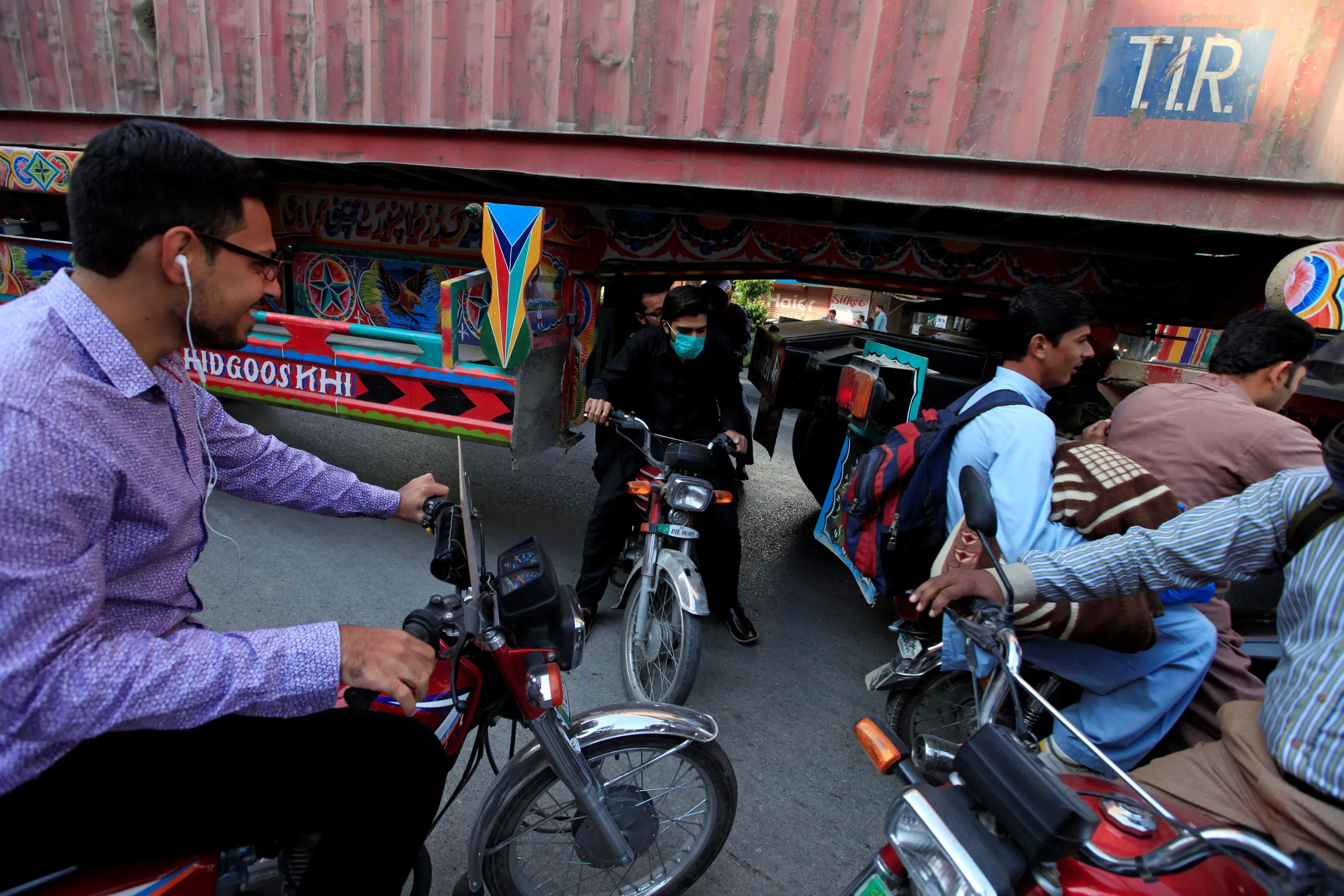 A motorcyclist slips through a gap in a barricade set up using shipping containers near the venue of a planned protest gathering organised by Awami Muslim League (AML), a political ally party of Imran Khan's Pakistan Tehreek-e-Insaf (PTI), in Rawalpindi, Pakistan, October 28, 2016. (Photo by Faisal Mahmood/Reuters)