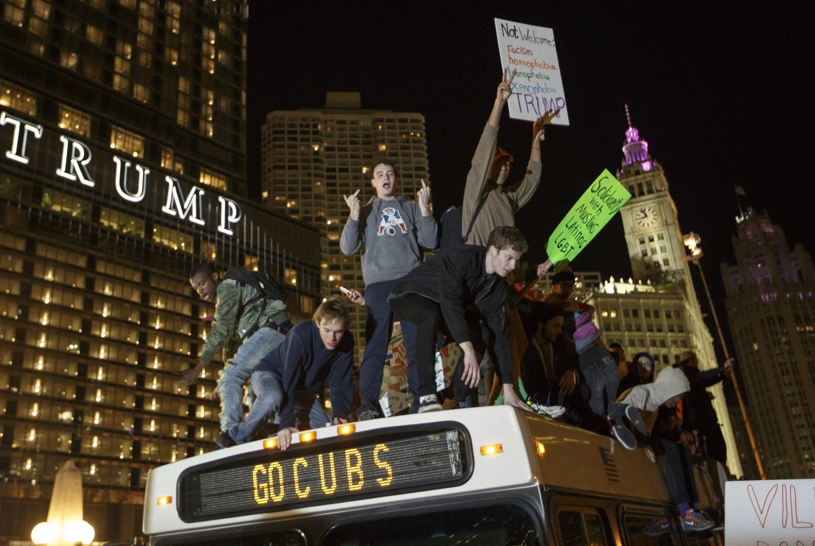 Demostrators protest on top of a bus outside of the Trump Tower November 9, 2016 in Chicago, Illinois. Thousands of people in several cities across the country took to the streets a day after Donald Trump was elected president. (Photo by John Gress/Getty Images)