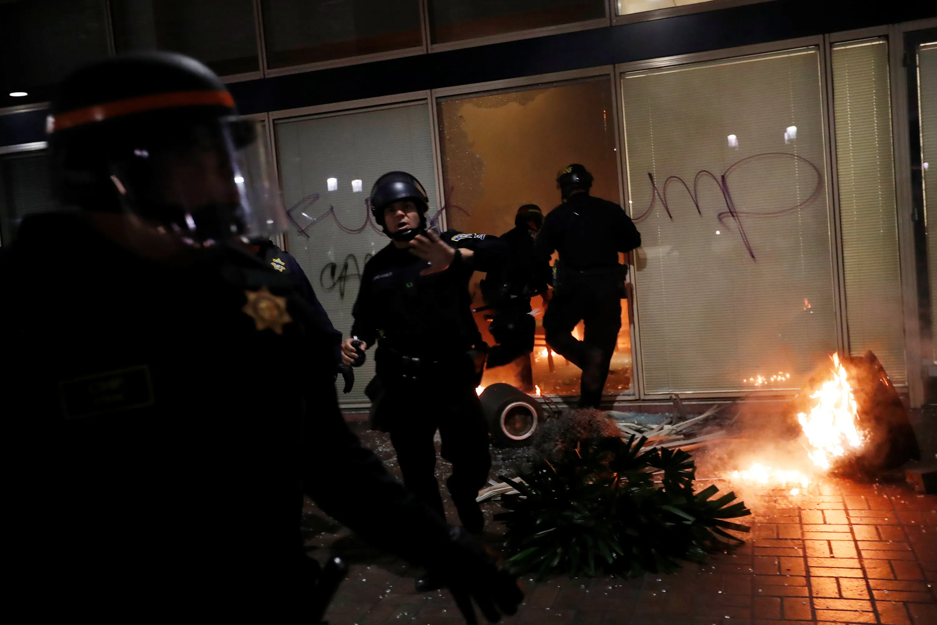 Police officers work to control the scene of an office set aflame by demonstrators during a demonstration in Oakland, California, U.S. following the election of Donald Trump as President of the United States November 9, 2016. (Photo by Stephen Lam/Reuters)