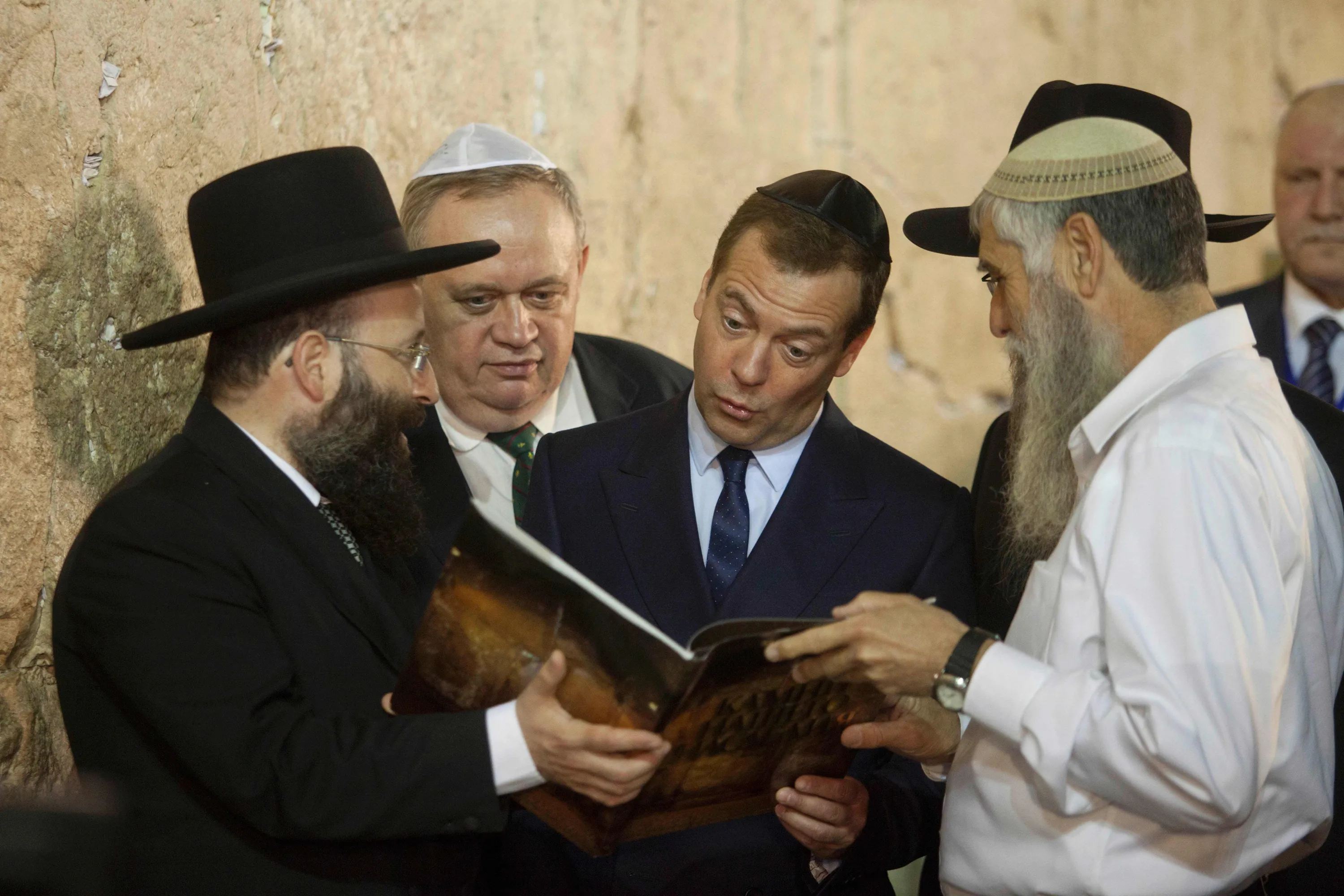 Russian Prime Minister Dmitry Medvedev receives a book during his visit at the Western Wall, the holiest site where Jews can pray in Jerusalem' s Old City in Jerusalem, Thursday, November 10, 2016. Medvedev is on a high level visit to Israel to explore issues of mutual interest. (Photo by Dan Balilty/AP Photo)