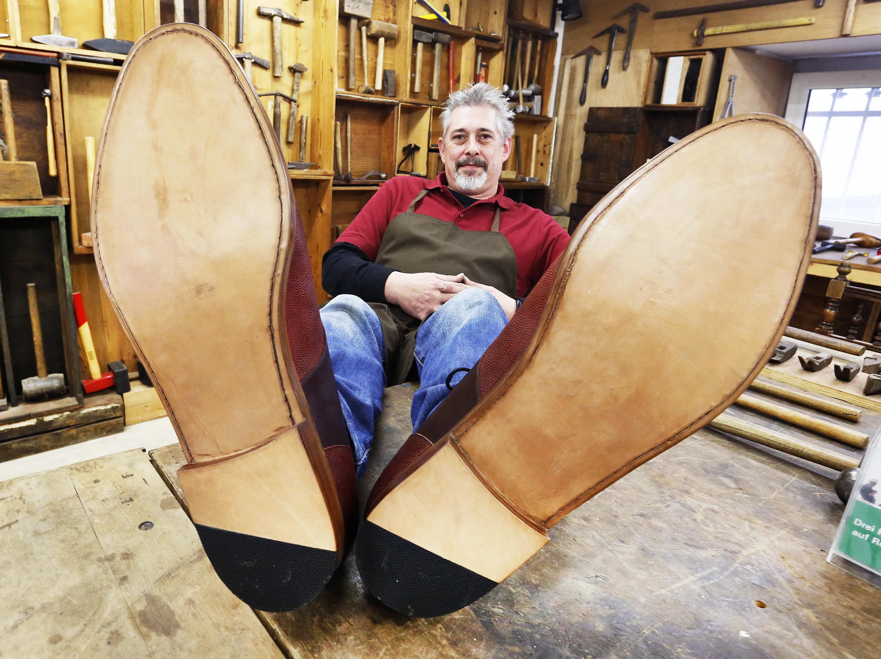 Shoemaker Juergen Dohn poses with shoes he made in 150 hours of work with the size of 75 (US 34) in Frankfurt, Germany, Thursday, November 10, 2016. Dohn claims the leather shoes are the largest wearable shoes in the world. (Photo by Michael Probst/AP Photo)