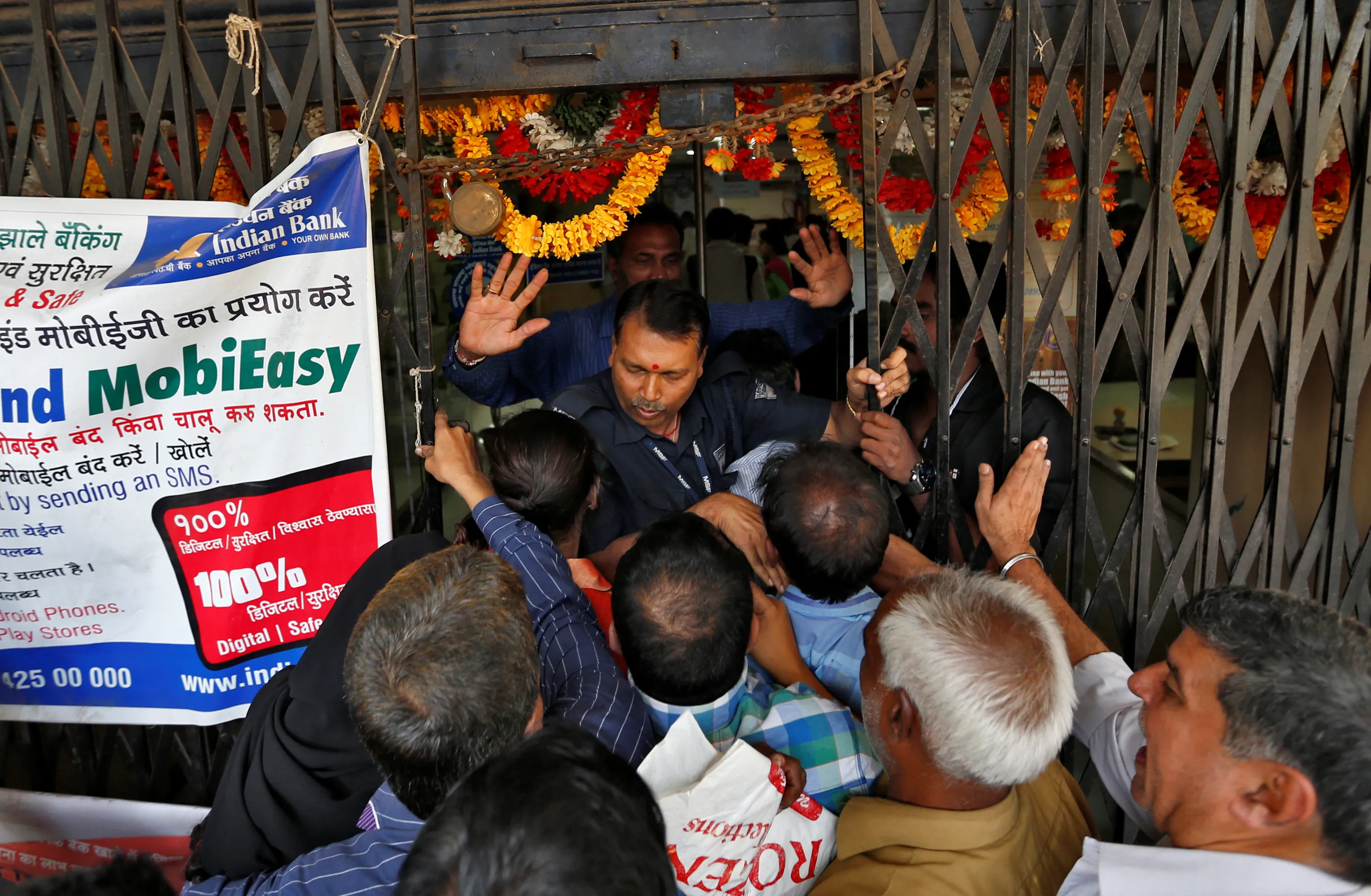 A security guard tries to close the gate as as people try to enter a bank in Mumbai, India, November 10, 2016. (Photo by Danish Siddiqui/Reuters)