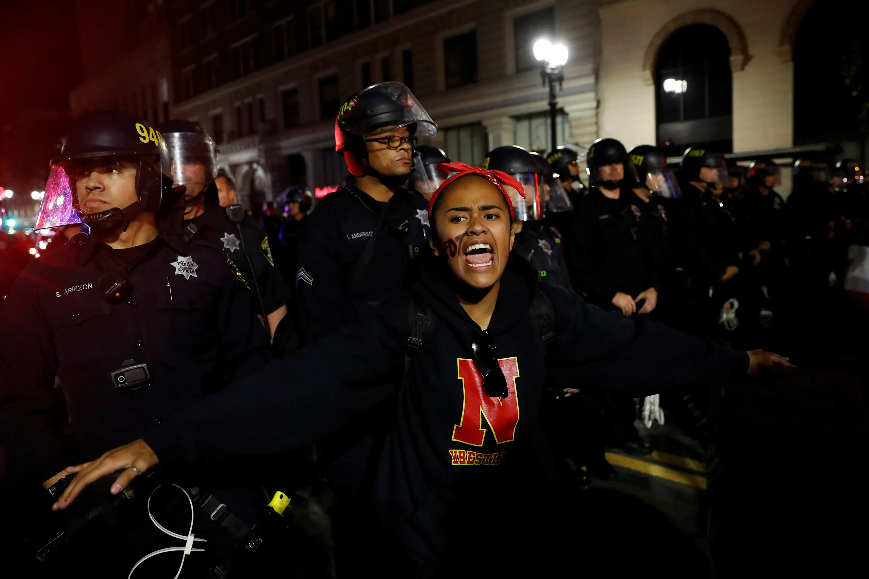 A demonstrator pleads others to stand back from the police line during a demonstration following the election of Donald Trump as President of the United States, in Oakland, California, U.S. November 10, 2016. (Photo by Stephen Lam/Reuters)