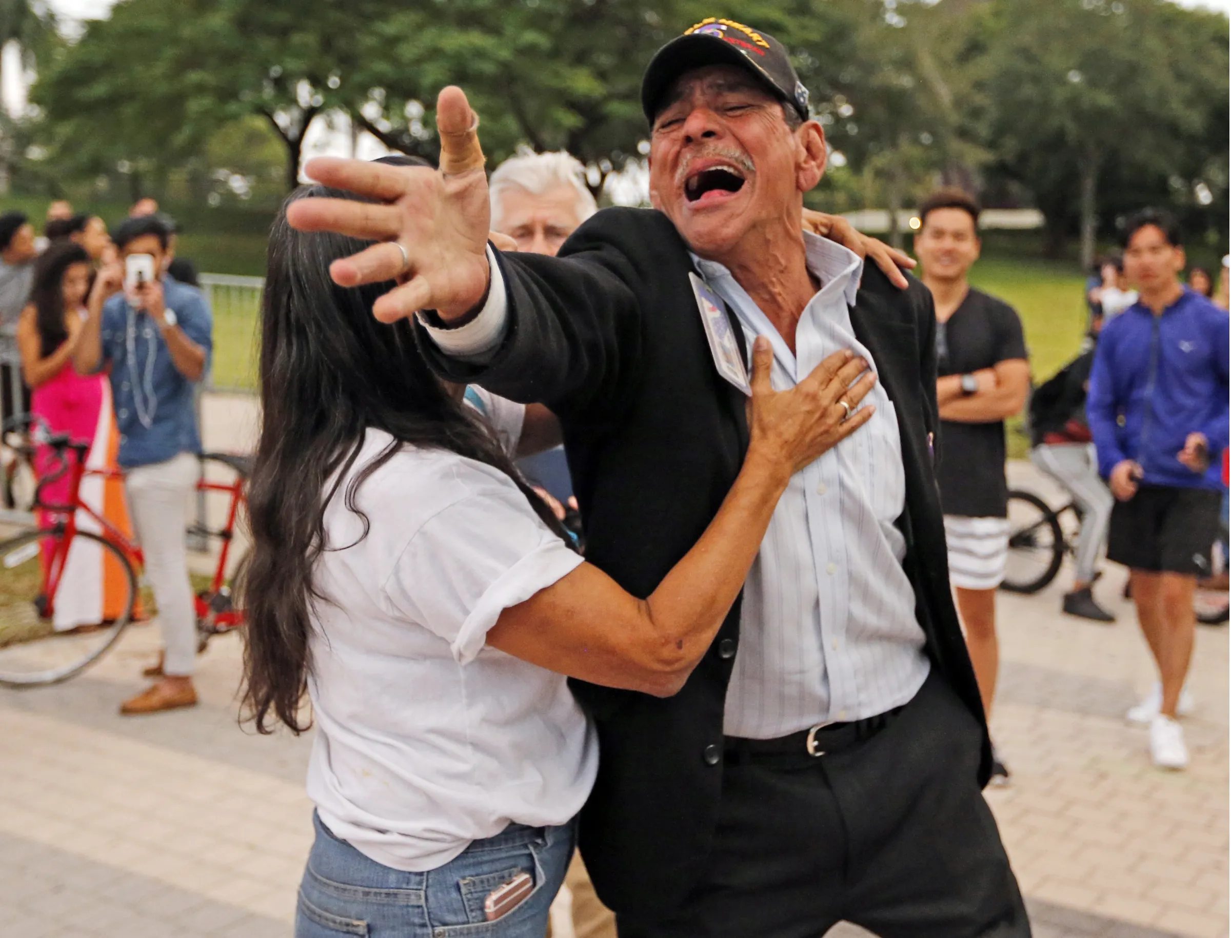 U.S. veteran Henry Espinosa hollers at a Trump supporter during a protest in opposition of President-elect Donald Trump, Friday, November 11, 2016, at Bayfront Park in Miami. (Photo by Al Diaz/Miami Herald via AP Photo)