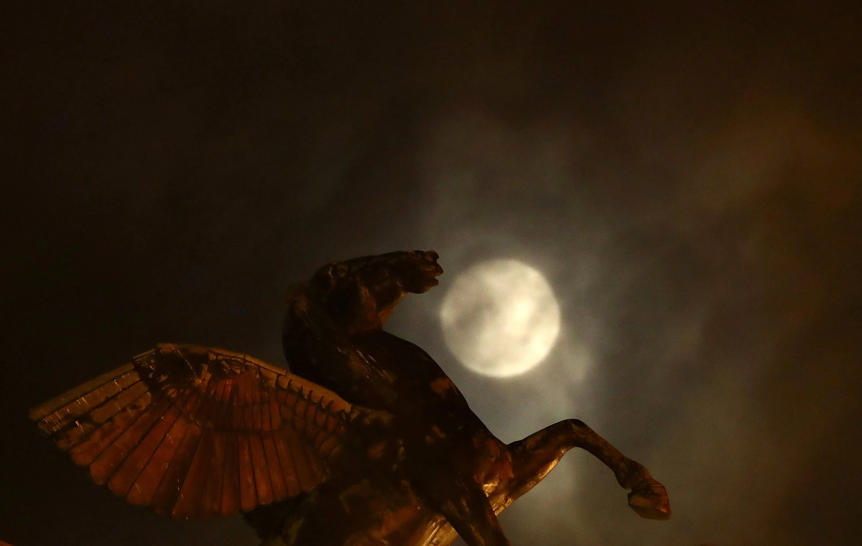 The moon is partly covered by clouds as it rises behind the pegasus statue on top of the old opera house in downtown Frankfurt, Germany, November 14, 2016. (Photo by Kai Pfaffenbach/Reuters)
