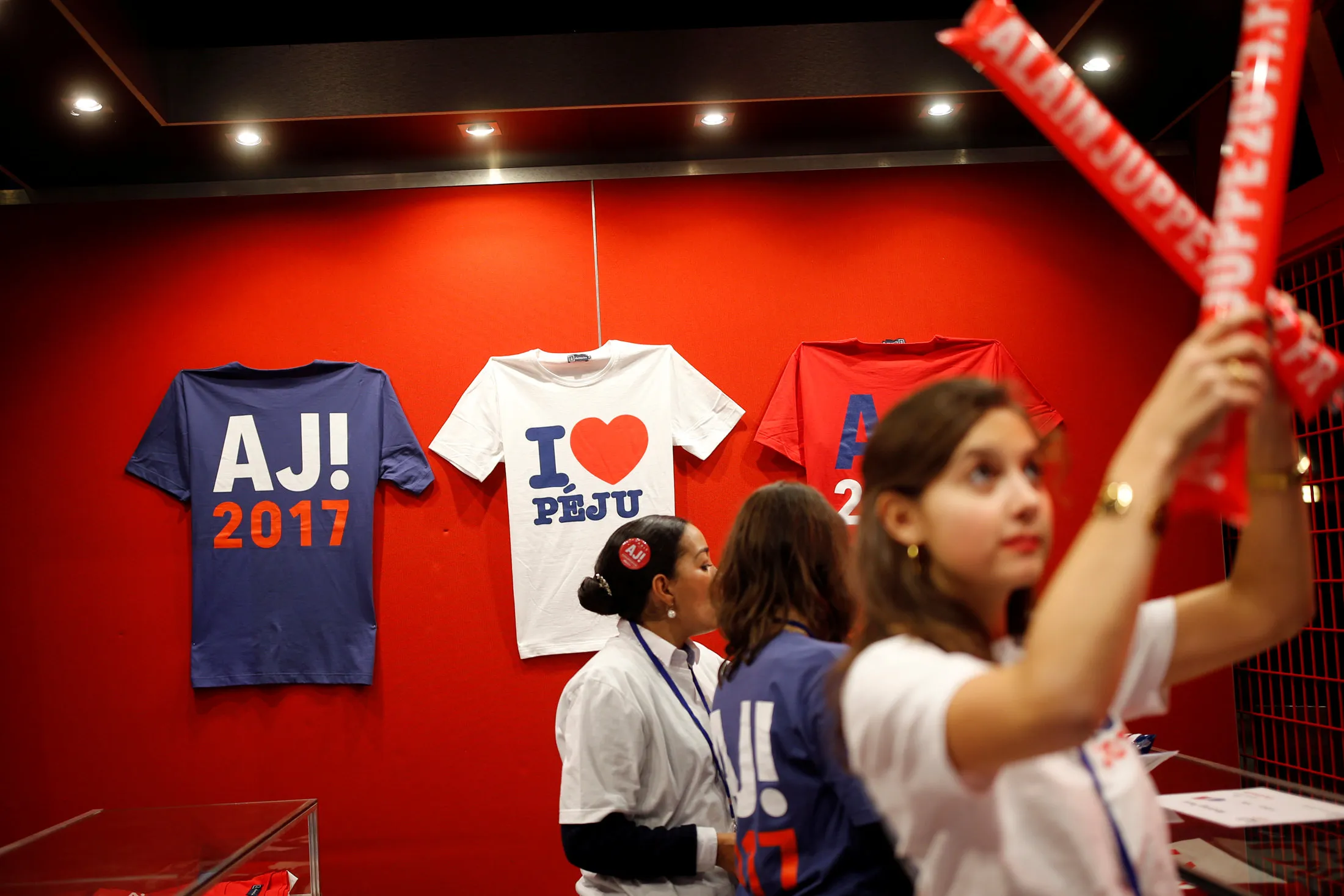 T-shirts advertising for the French politician Alain Juppe, current mayor of Bordeaux, a member of the conservative Les Republicains political party and candidate for their center-right presidential primary, are displayed at a campaign rally in Paris, France, November 14, 2016. (Photo by Benoit Tessier/Reuters)