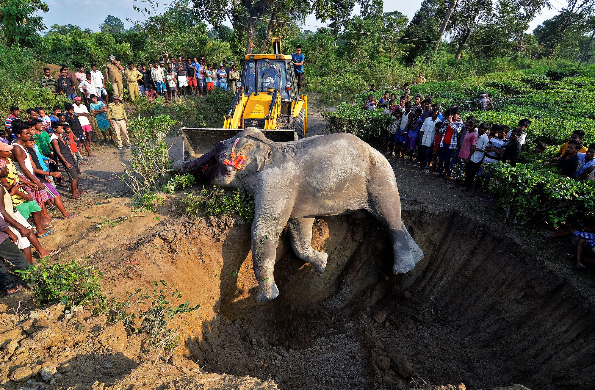 A carcass of a wild elephant, who according to the forest officials died due to electrocution by the low-tension electric wires, is pushed into a grave at a tea estate in Nagaon district in the Northeastern state of Assam, India on November 14, 2016. (Photo by Anuwar Hazarika/Reuters)