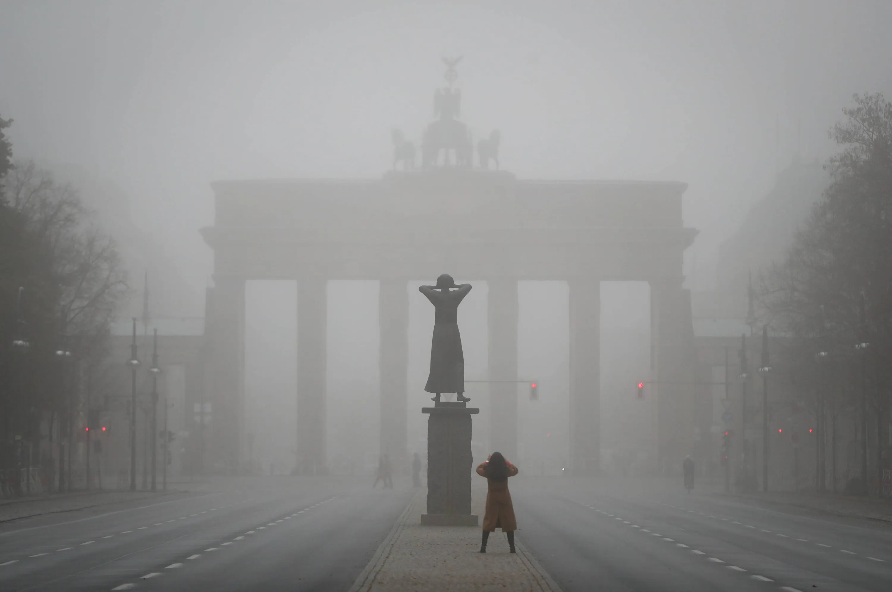 A woman photographs the Brandenburg Gate and the statue “The Crier” by Gerhard Marcks on a foggy morning in Berlin Wednesday, November 16, 2016. (Photo by Kay Nietfeld/DPA via AP Photo)