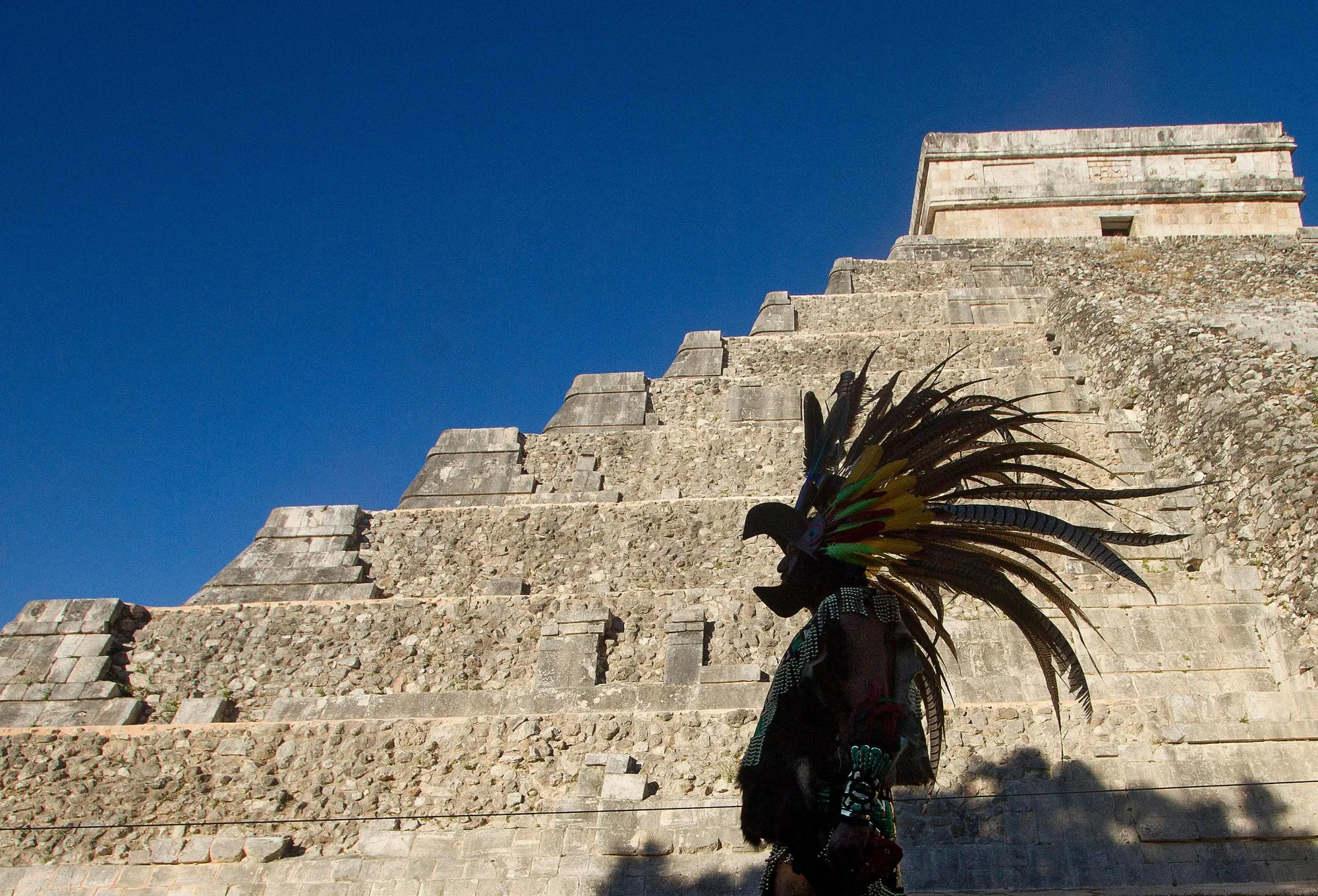 A Mexican man wearing a pre-hispanic costume walk next to the Kukulkan pyramid at the Chichen Itza archaeological park, in Yucatan state, Mexico on December 20, 2012. A pyramidal structure that could be from the 550 to 800 A.D. was found inside the Kukulkan temple, Mexican archaeologists and engineers said on November 16, 2016. (Photo by Pedro Pardo/AFP Photo)