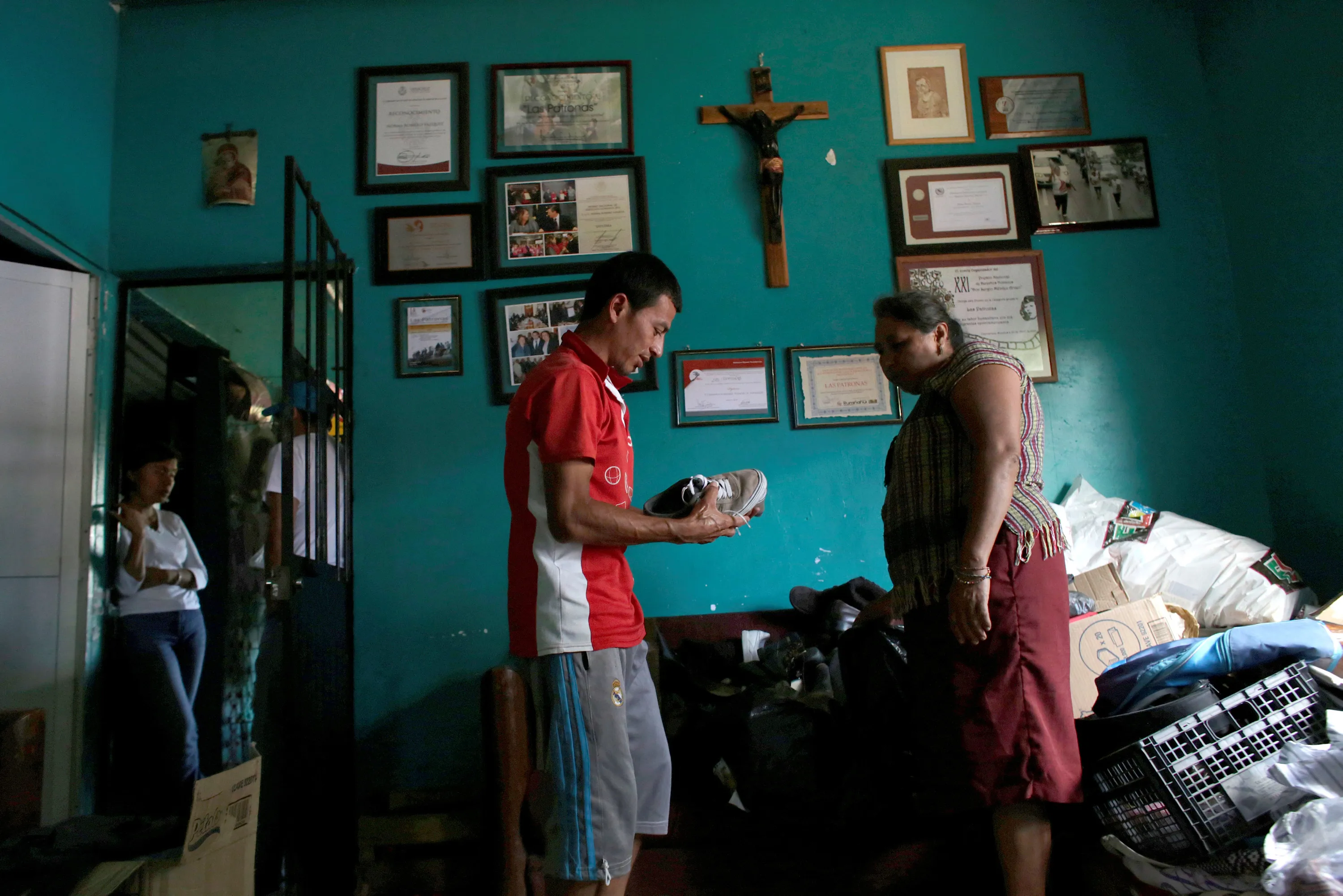 An immigrant receives a pair of shoes from a woman of a group called “Las Patronas” (The bosses), a charitable organization that feeds Central American immigrants on their way to the border with the United States who travel atop a freight train known as “La Bestia”, in Amatlan de los Reyes, in Veracruz state, Mexico October 22, 2016. (Photo by Daniel Becerril/Reuters)