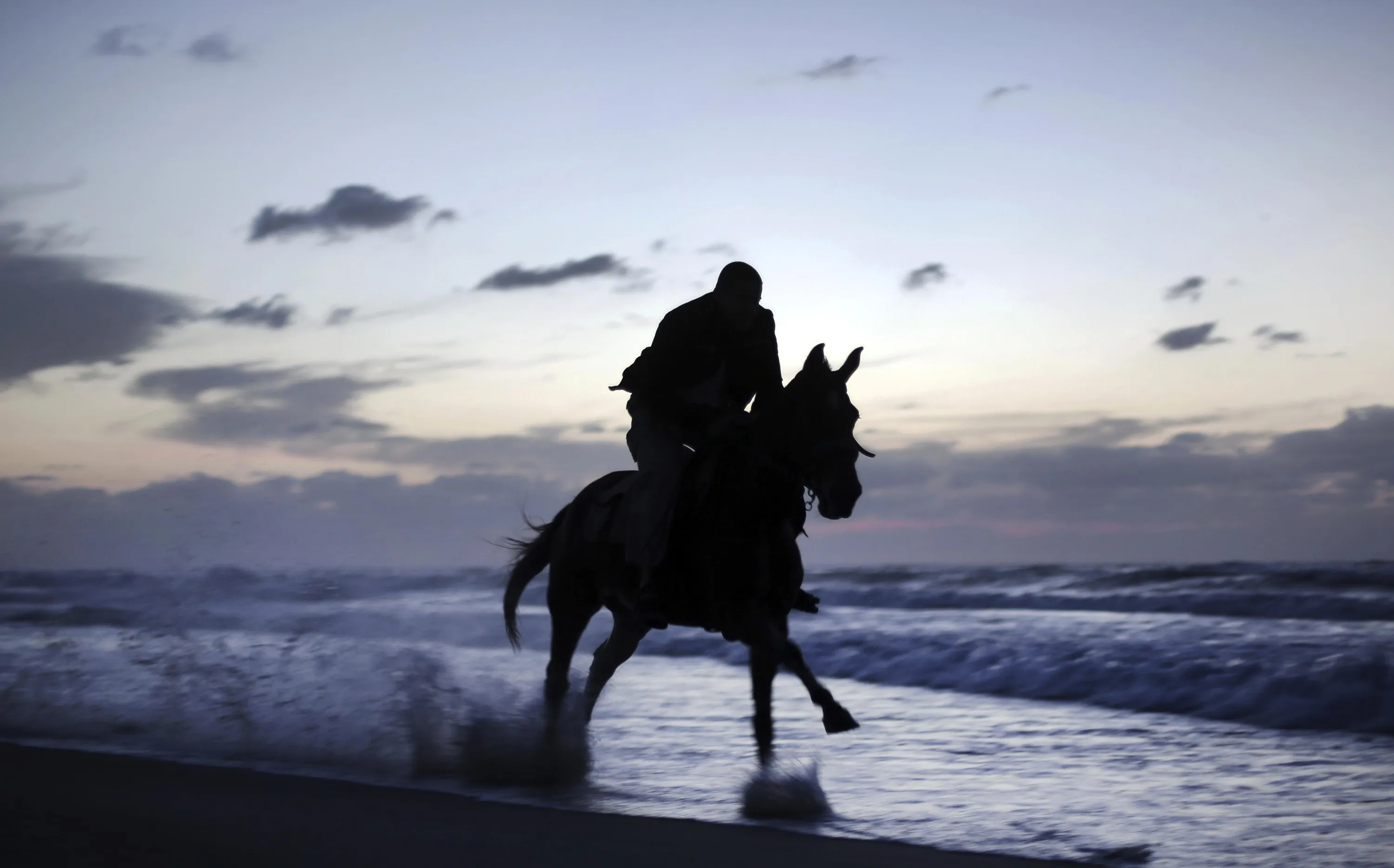 A Palestinian man rides a horse on the beach as the sun sets over Gaza city, Thursday, November 17, 2016. (Photo by Khalil Hamra/AP Photo)