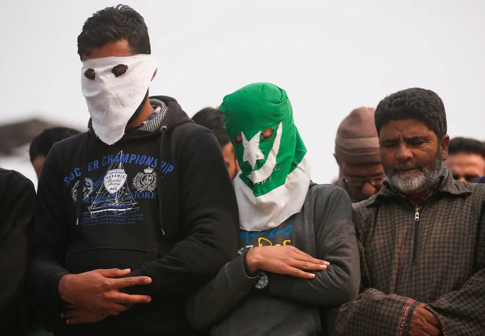 Masked protesters offer funeral prayers of Ghulam Mohammad Khan, a civilian who according to local media succumbed to injuries from a teargas shell fired by Indian police during a protest earlier this month, in Srinagar, November 17, 2016. (Photo by Danish Ismail/Reuters)