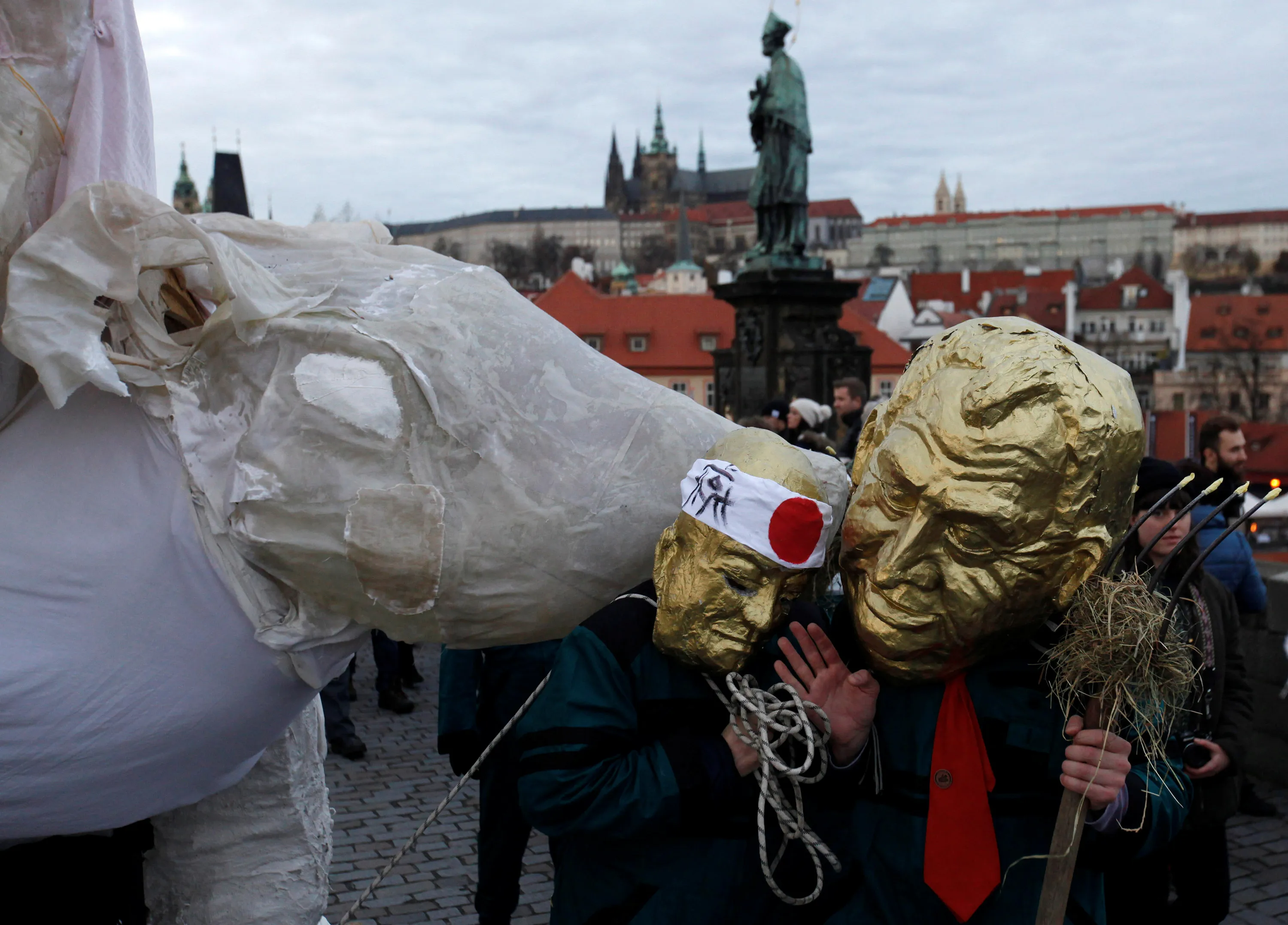 People wearing masks march across the medieval Charles Bridge to commemorate the 27th anniversary of 1989 Velvet Revolution in Prague, Czech Republic, November 17, 2016. (Photo by David W. Cerny/Reuters)