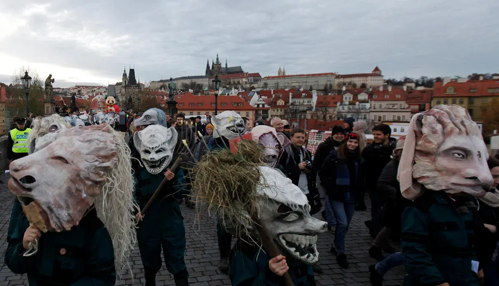 People wearing masks march across the medieval Charles Bridge to commemorate the 27th anniversary of 1989 Velvet Revolution in Prague, Czech Republic, November 17, 2016. (Photo by David W. Cerny/Reuters)