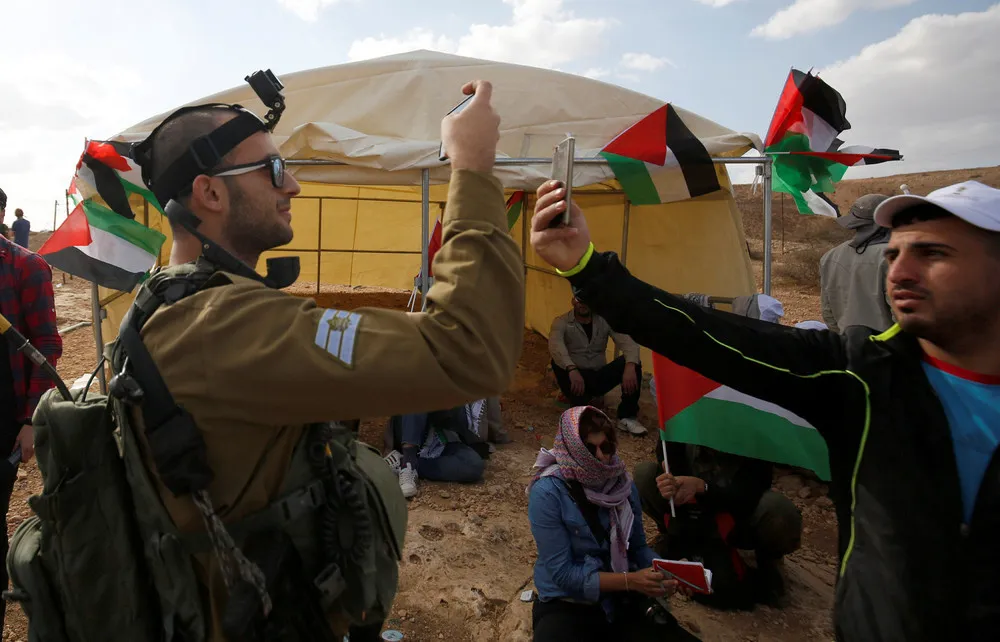 A Palestinian demonstrator uses his mobile phone to oppose an Israeli soldier using his mobile as they argue during a protest against Jewish settlements in Jordan Valley near the West Bank city of Jericho November 17, 2016. (Photo by Mohamad Torokman/Reuters)