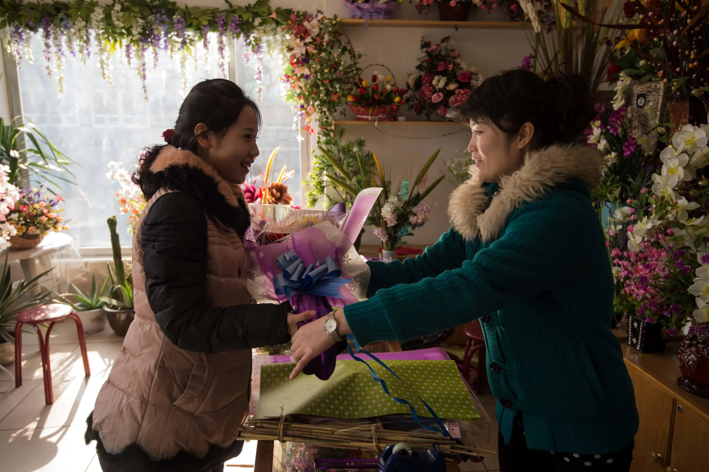 In a photo taken on November 16, 2016 a woman buys flowers from a vendor in Pyongyang. The North Korean capital was celebrating “Mother's Day”, a public holiday reportedly started in 2012 with the aim of “honouring all mothers” including the ruling Workers Party, often referred to as the “Mother Party”. (Photo by Kim Won-Jin/AFP Photo)