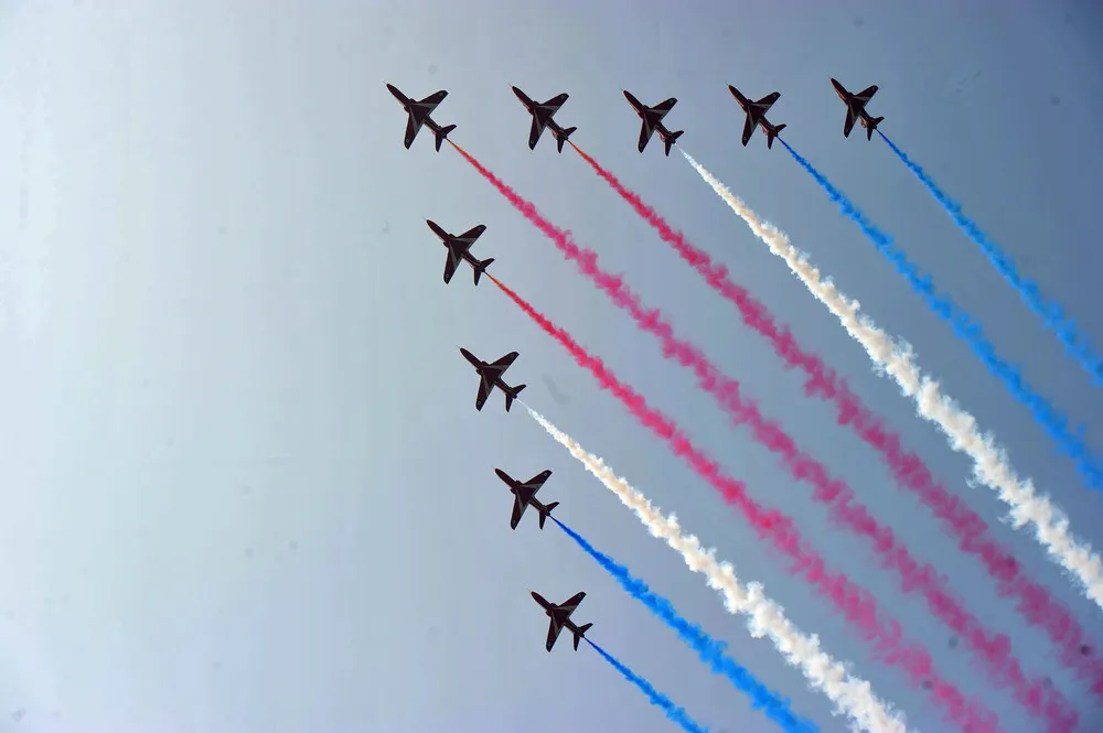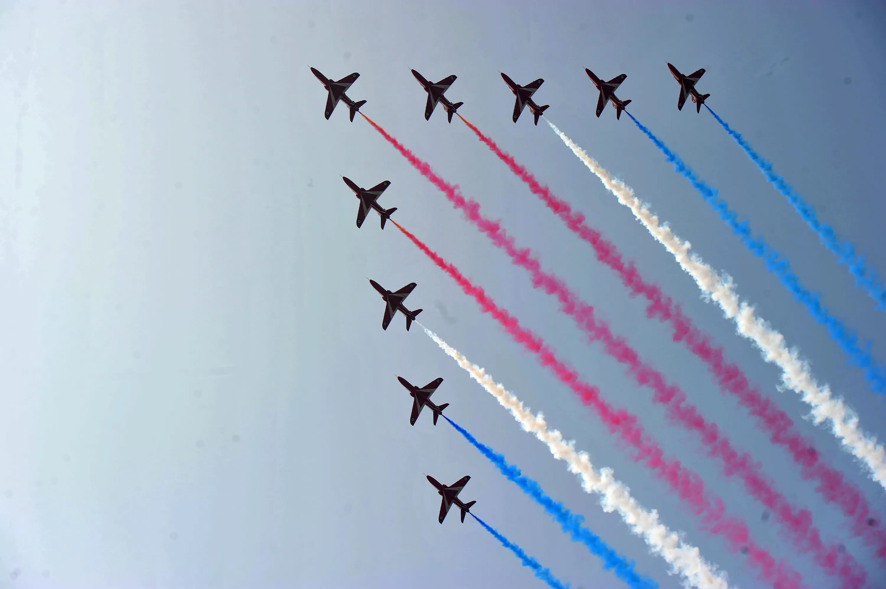 The British Royal Air Force (RAF) aerobatic team, the “Red Arrows” perform manoeuvres at the Indian Air Force Academy, Dundigal on the outskirts of Hyderabad on November 17, 2016. The RAF Aerobatic team is on a visit to India as a part of a major 60-day tour of the Asia-Pacific and Middle East regions. (Photo by Noah Seelam/AFP Photo)