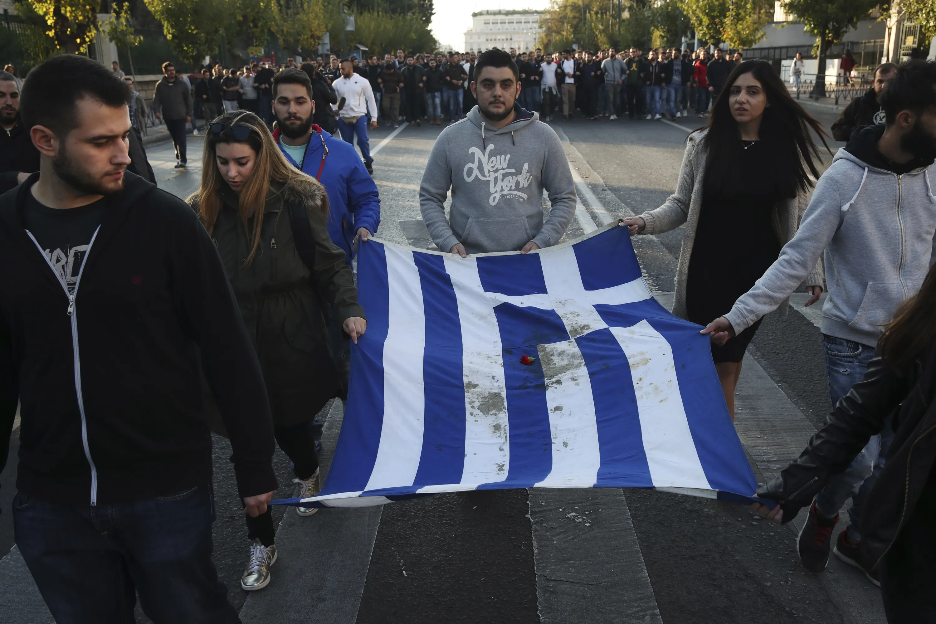 University students hold a blood-stained Greek flag from the deadly 1973 student uprising in Athens, Thursday, November 17, 2016. Several thousand people marched to the U.S. Embassy in Athens under tight police security to commemorate a 1973 student uprising that was crushed by Greece's military junta, that ruled the country from 1967-74. (Photo by Yorgos Karahalis/AP Photo)