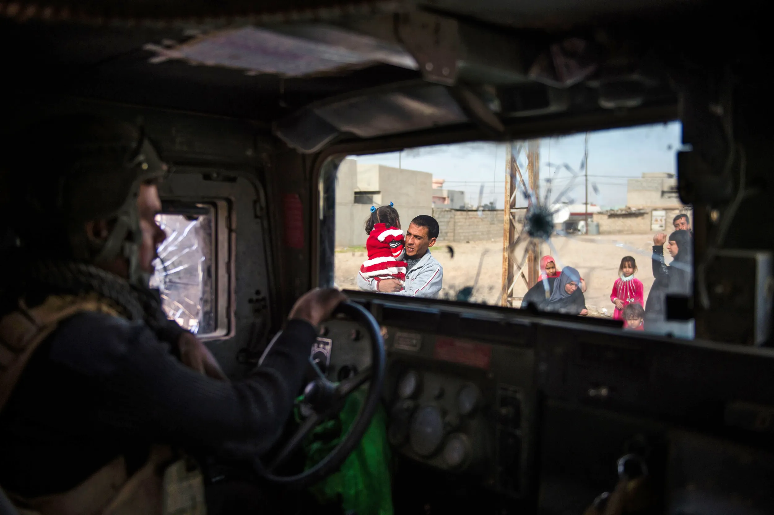 People fleeing the fighting are seen from inside an Iraqi Special Forces 2nd division Humvee in Mosul's Arbagiah neighbourhood on November 13, 2016, as they continued to battle Islamic State (IS) group forces pushing through the Arbagiah area and into the neighbourhood of Karkukli. (Photo by Odd Andersen/AFP Photo)