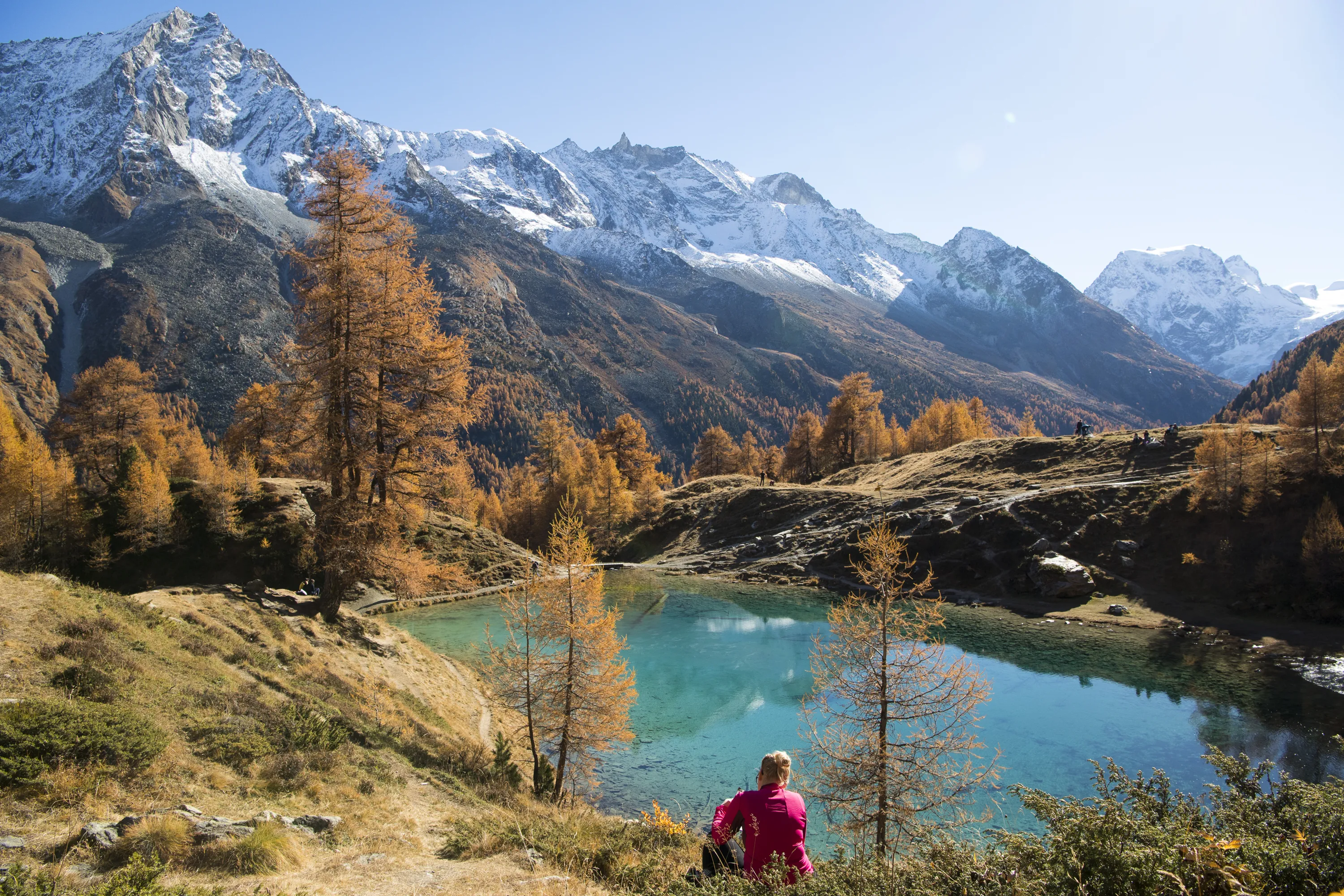 A woman enjoys the sun next to the Lac Bleu Lake near Evolene, Switzerland, on Tuesday, November 1, 2016. (Photo by Anthony Anex/Keystone via AP Photo)