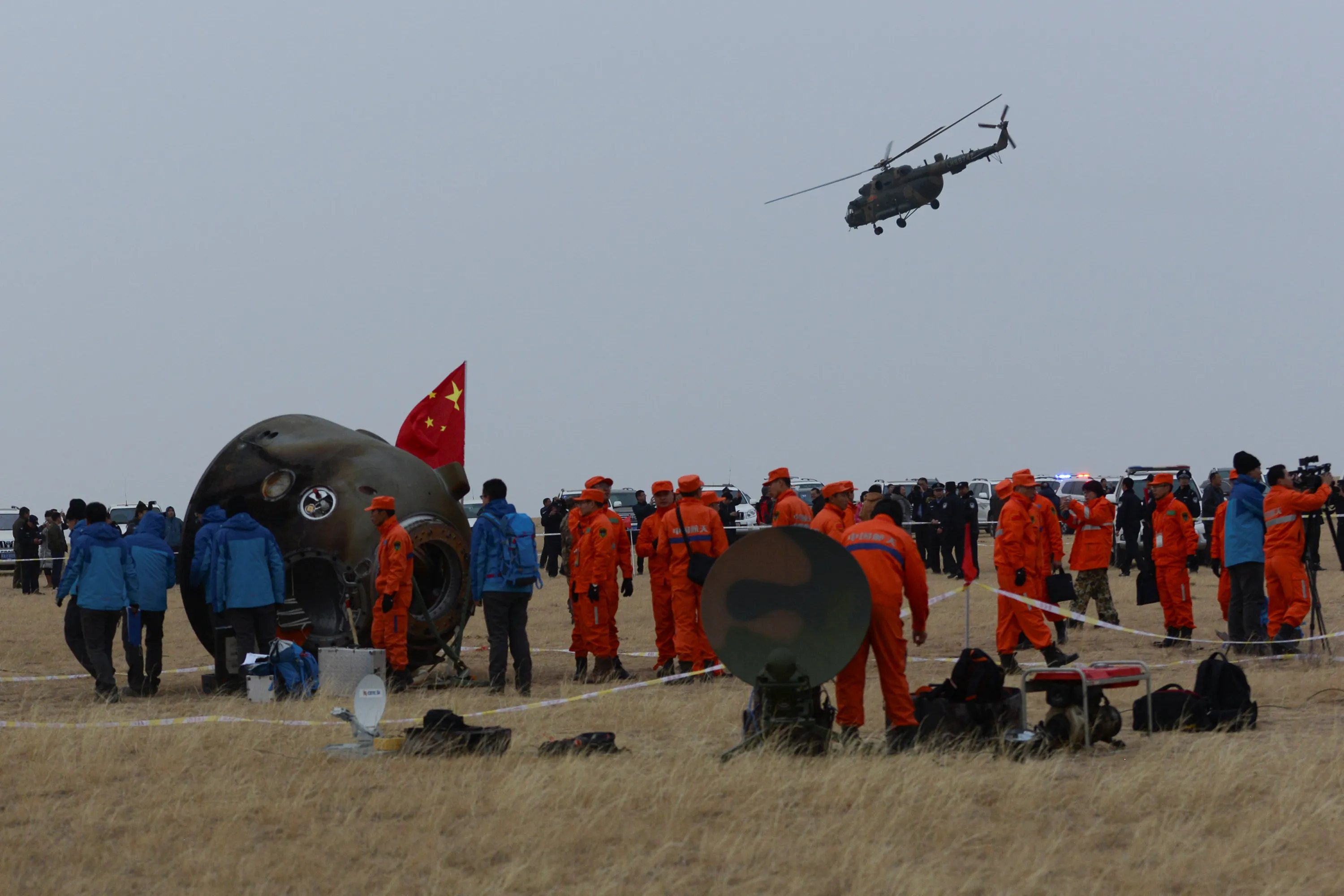 Researchers examine the re-entry capsule of China's Shenzhou-11 spacecraft after it landed on earth with two astronauts Jing Haipeng and Chen Dong, north of Inner Mongolia Autonomous Region, China, November 18, 2016. (Photo by Reuters/China Daily)