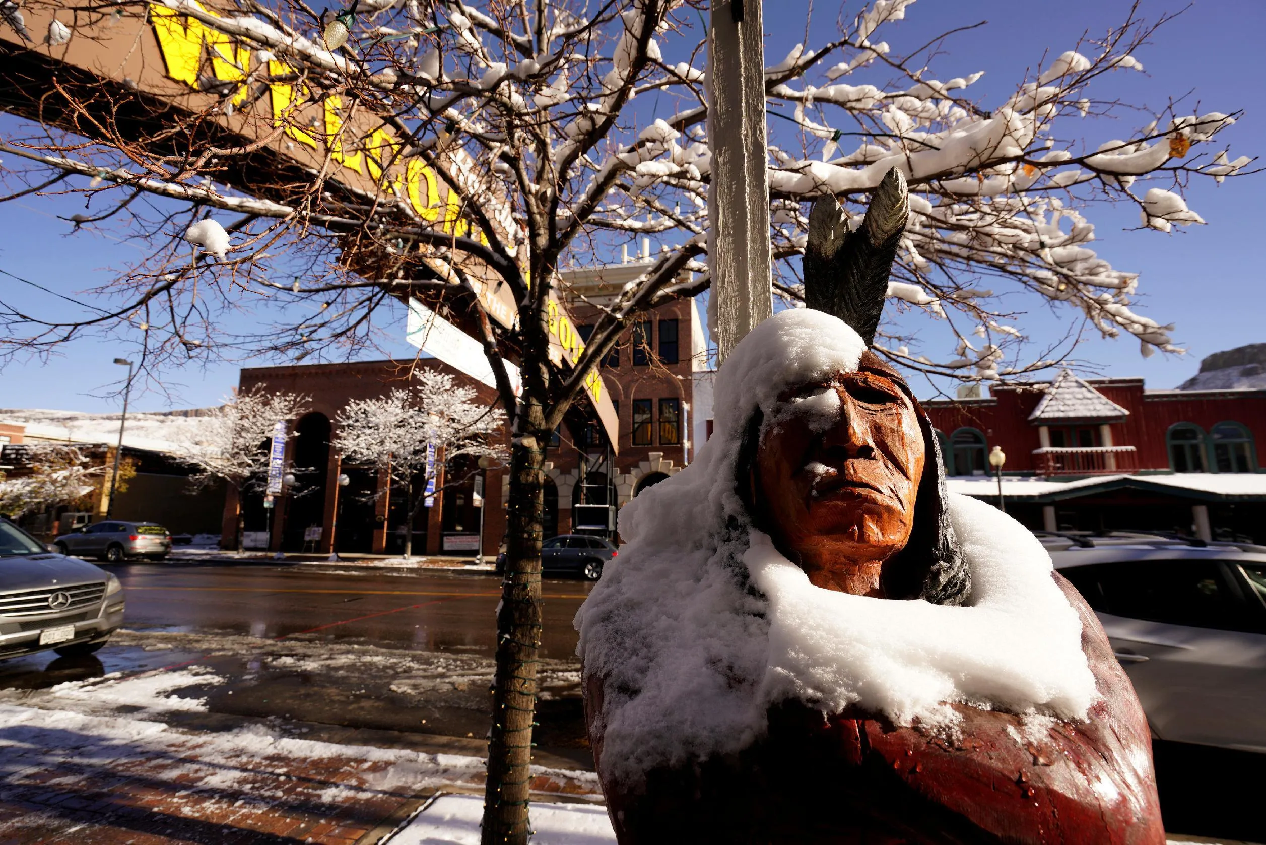 A sculpture of a Native American has snow on its face in the aftermath of the Denver area's first snowstorm of the season in Golden, Colorado November 18, 2016. (Photo by Rick Wilking/Reuters)