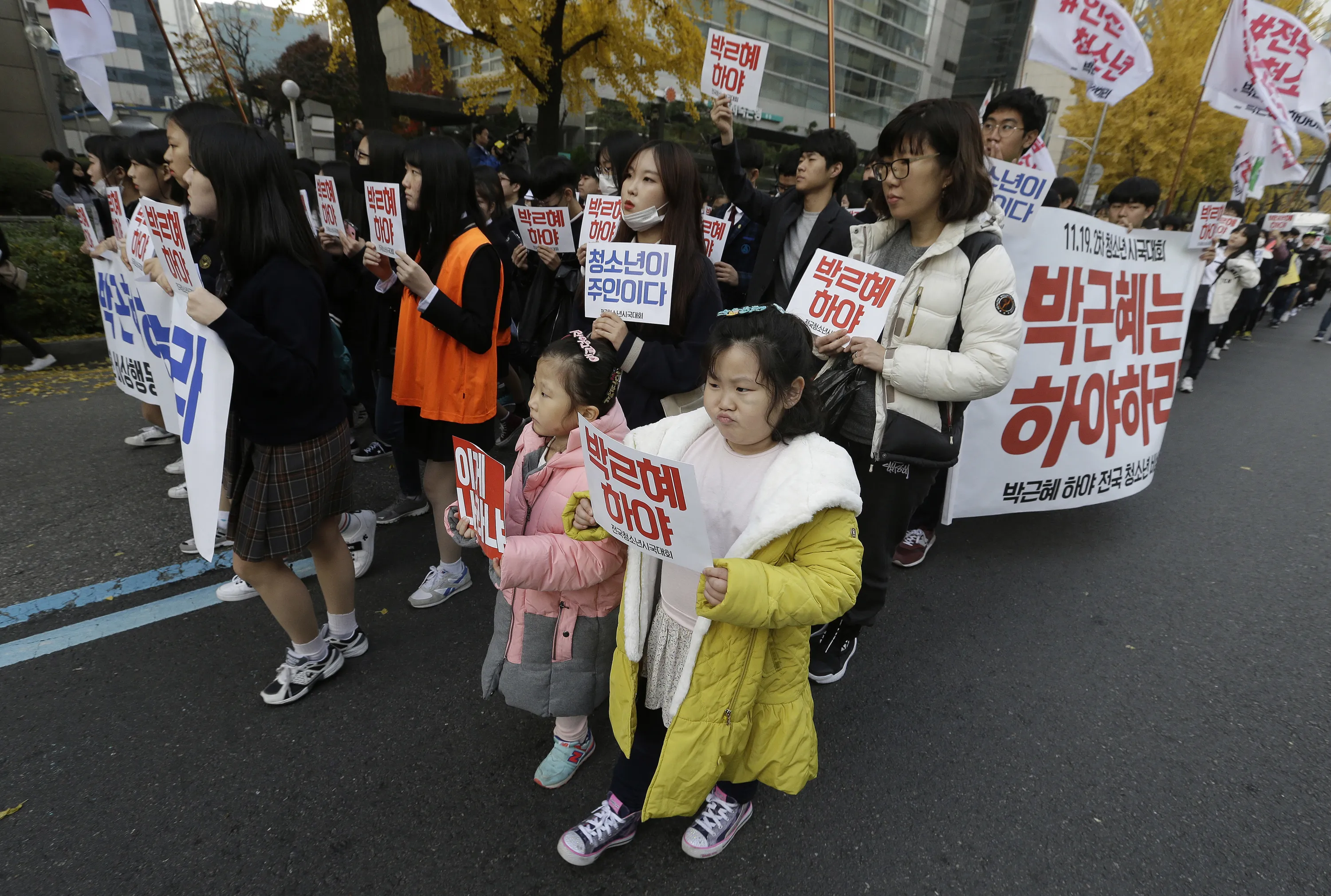 South Korean children march with high school students during a rally calling for South Korean President Park Geun-hye to step down in Seoul, South Korea, Saturday, November 19, 2016. For the fourth straight weekend, masses of South Koreans were expected to descend on major avenues in downtown Seoul demanding an end to the presidency of Park, who prosecutors plan to question soon over an explosive political scandal. The letters read “Park Geun-hye should step down”. (Photo by Ahn Young-joon/AP Photo)