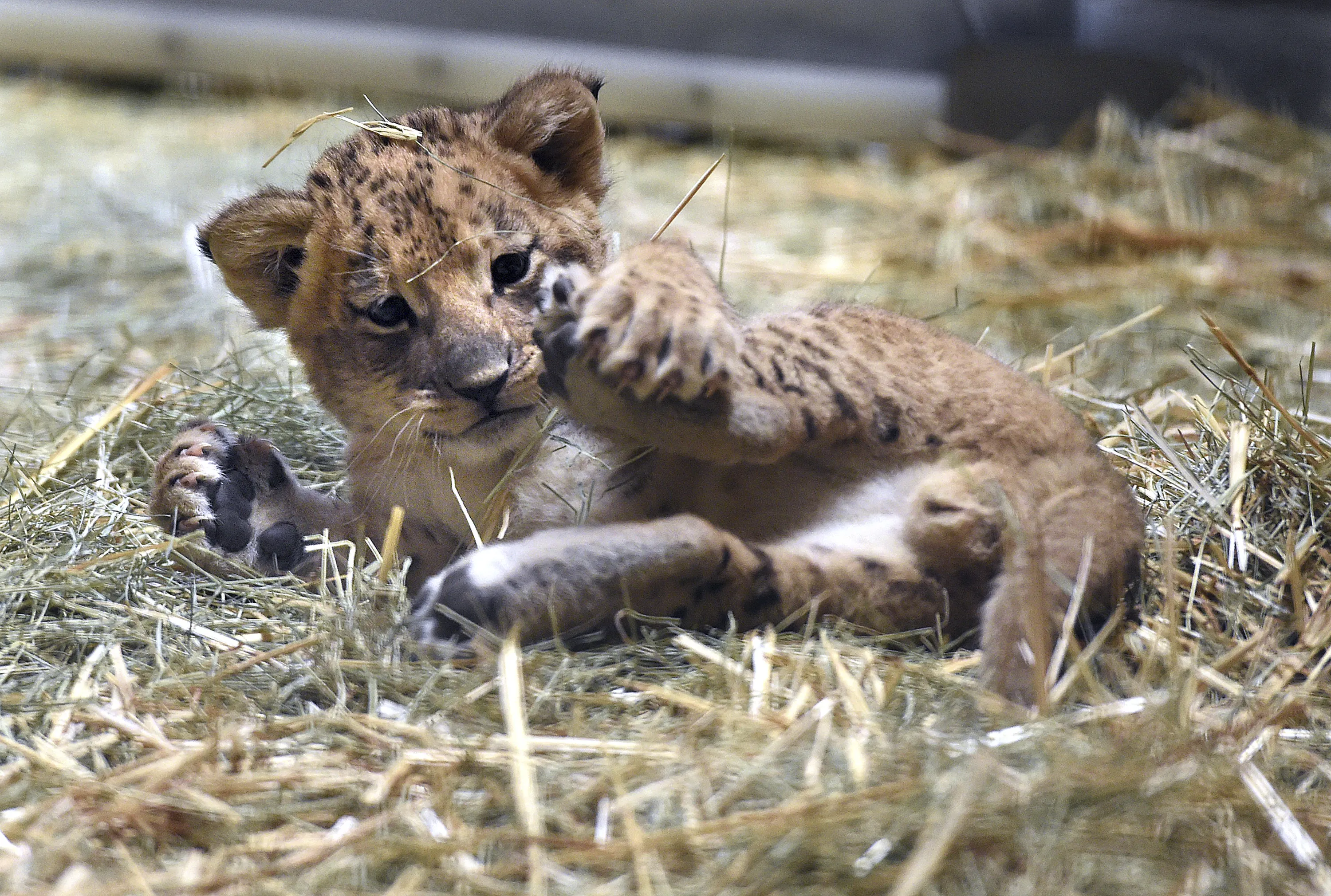 This November 17, 2016 photo shows a 5-week-old lion plays with his leg in the hay of his enclosure at the Fresno Chaffee Zoo, in Fresno, Calif. The zoo is showing off a new lion cub and asking zoo-goers to choose his name. (Photo by John Walker/The Fresno Bee via AP Photo)