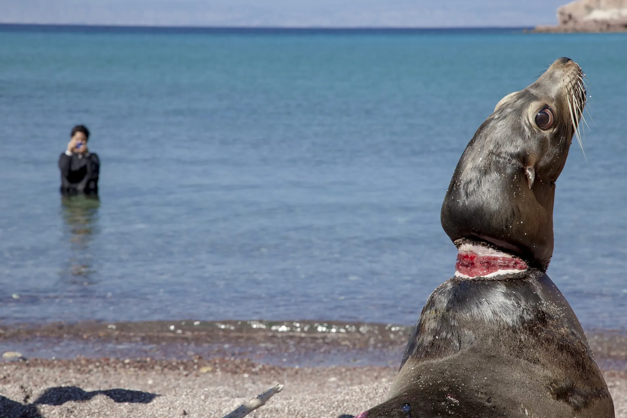 This November 10, 2016 photo released by Mexico's office for environmental protection (PROFEPA) shows a sea lion after it was untangled from fishing lines which severely injured its neck, as it is released back into the wild in Espiritu Santo, Mexico. PROFEPA says their program to untangle sea lions has successfully operated on seven of the animals in the area and is training personnel from the states of Sonora and Baja California, to extend the program to other areas. (Photo by Christian Vizl/PROFEPA via AP Photo)