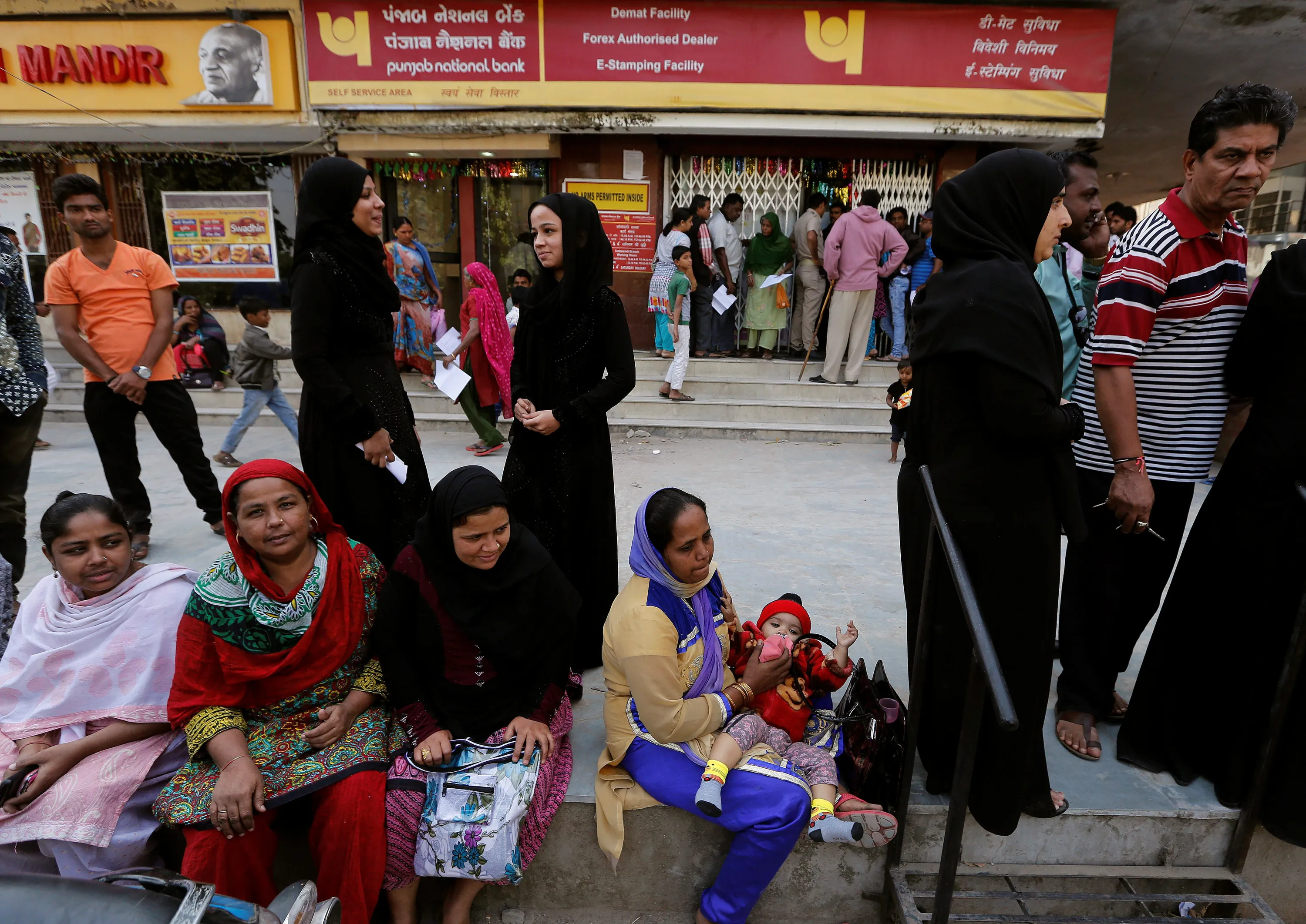 A woman feeds her baby as she and others queue outside a bank to exchange their old high denomination banknotes in Ahmedabad, India, November 17, 2016. (Photo by Amit Dave/Reuters)