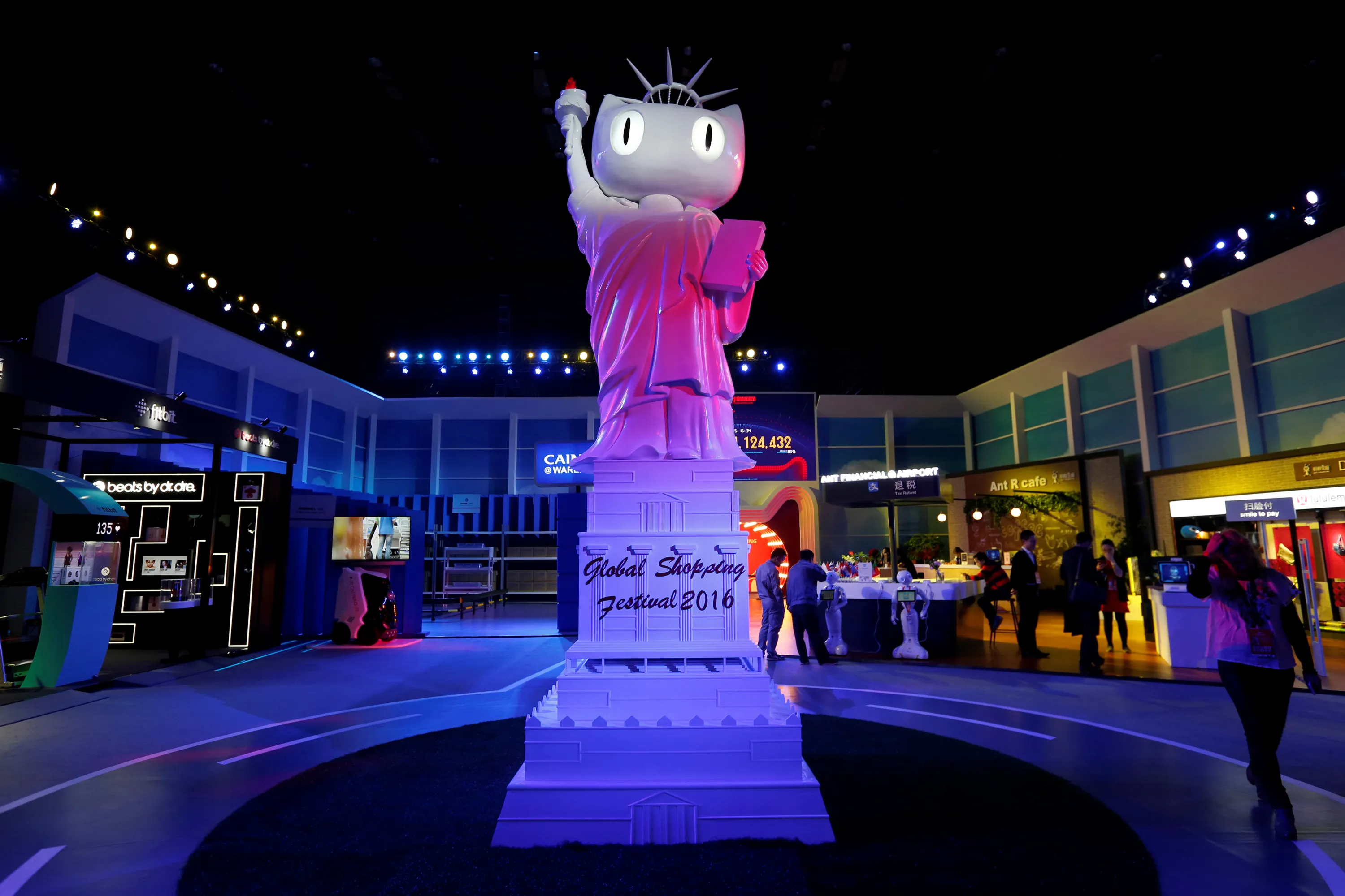 A statue symbolising Tmall.com is displayed inside an exhibition venue during Alibaba Group's 11.11 Singles' Day global shopping festival in Shenzhen, China November 11, 2016. (Photo by Bobby Yip/Reuters)