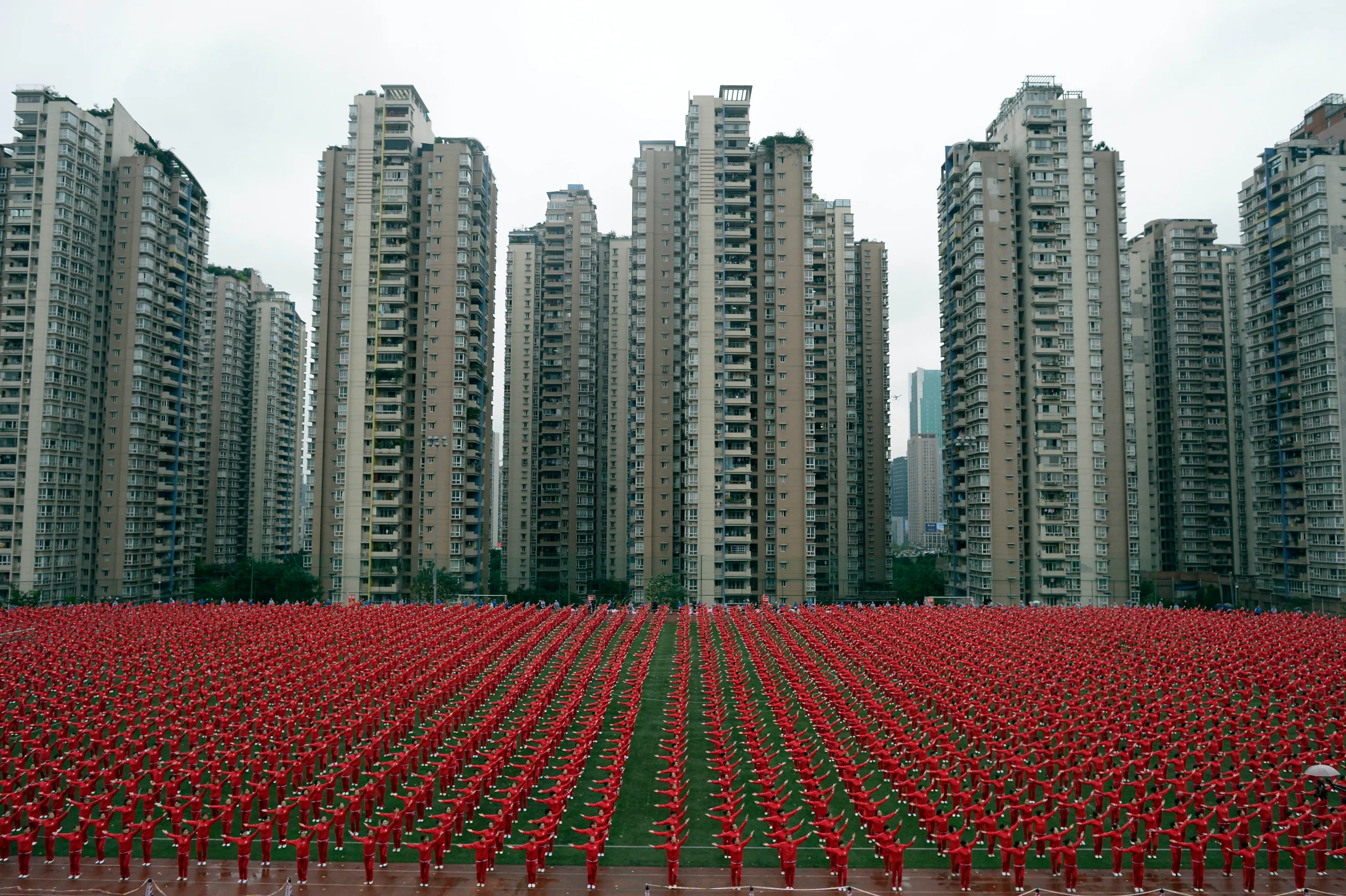 About 4,000 citizens perform square dance in the rain to make a Guinness World Record with dancers in other 13 cities on November 7, 2016 in Chongqing, China. 50,085 people in 14 cities performed the same square dances at the same time, and set the Guinness World Record for multiple-site large-scale dancing on Monday morning. (Photo by Feature China/Barcroft Images)