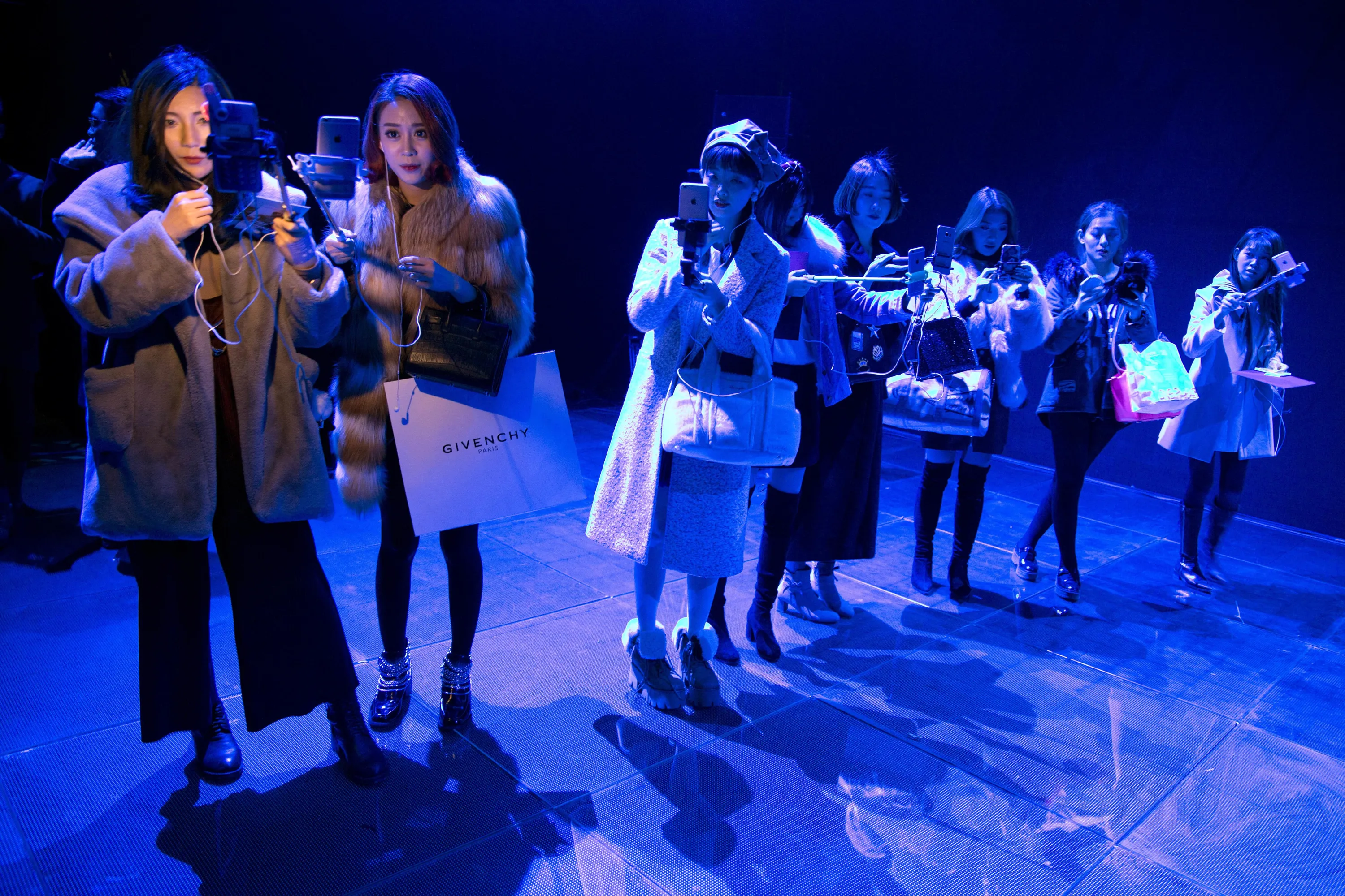 Web bloggers use selfie sticks to live broadcast their coverage at a fashion show to coincide with Singles' Day at the JD.com headquarters in Beijing, China, Friday, November 11, 2016. In a bright spot for China's cooling economy, online shoppers spent billions of dollars Friday on “Singles' Day”, a quirky holiday that has grown into the world's busiest day for e-commerce. (Photo by Ng Han Guan/AP Photo)
