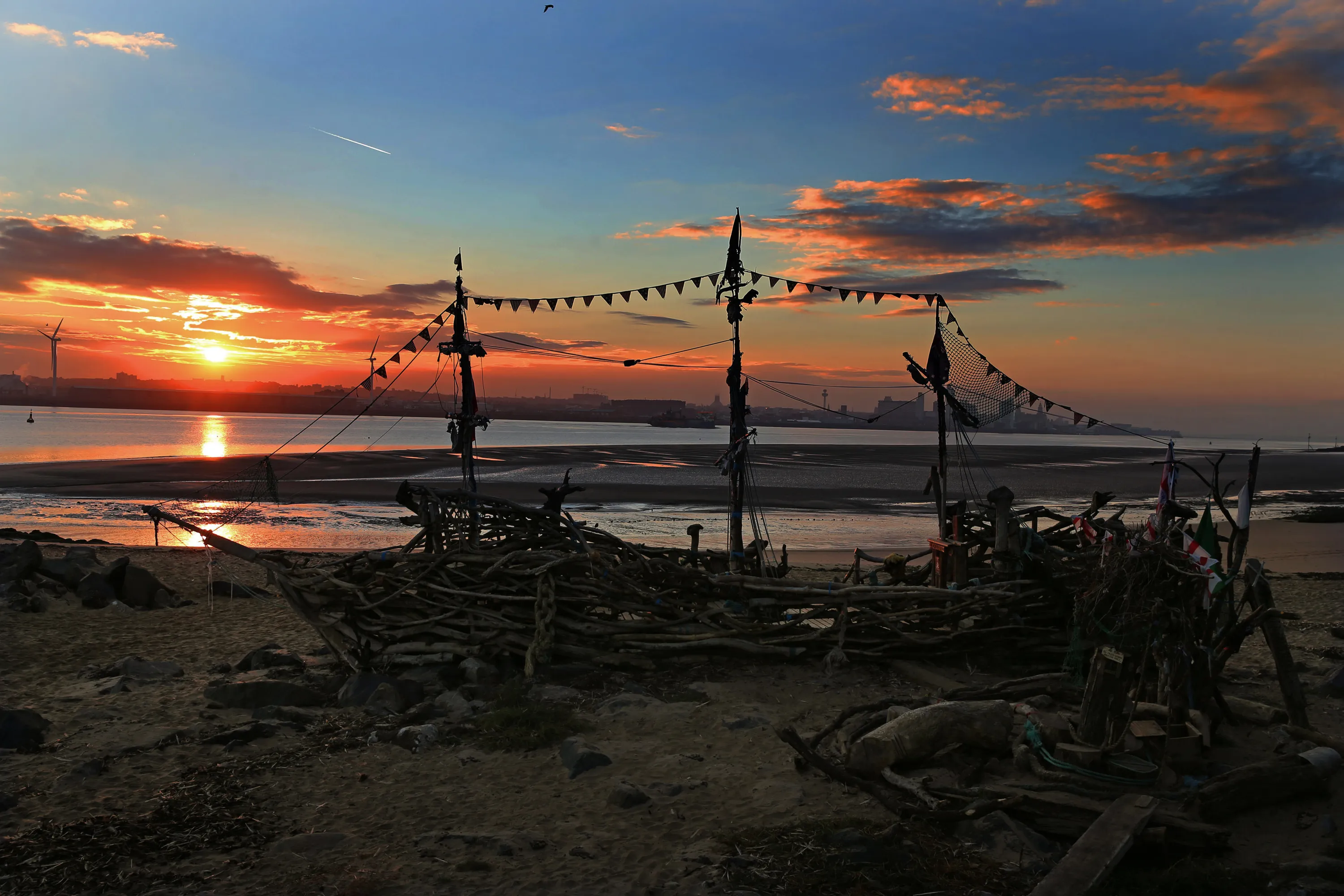 The sun rises behind a beach installation made of driftwood of the Black Pearl pirate ship on New Brighton beach, Liverpool, northwest England, Thursday, October 15, 2015. The installation was created by artist Frank Lund and Major Mace. (Photo by Peter Byrne/PA Wire via AP Photo)