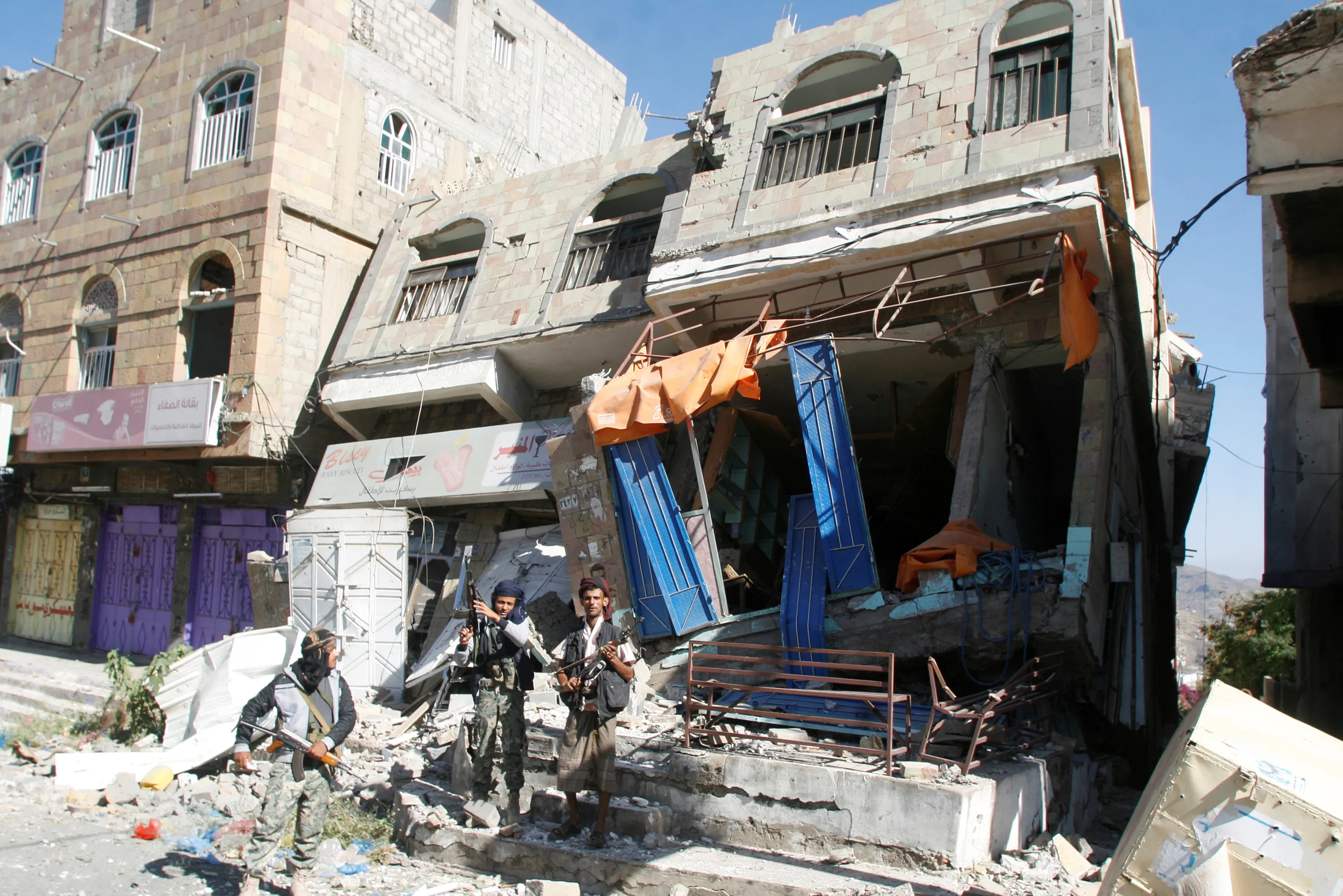 Pro-government fighters stand in front of a damaged building in the southwestern city of Taiz, Yemen November 21, 2016. (Photo by Anees Mahyoub/Reuters)