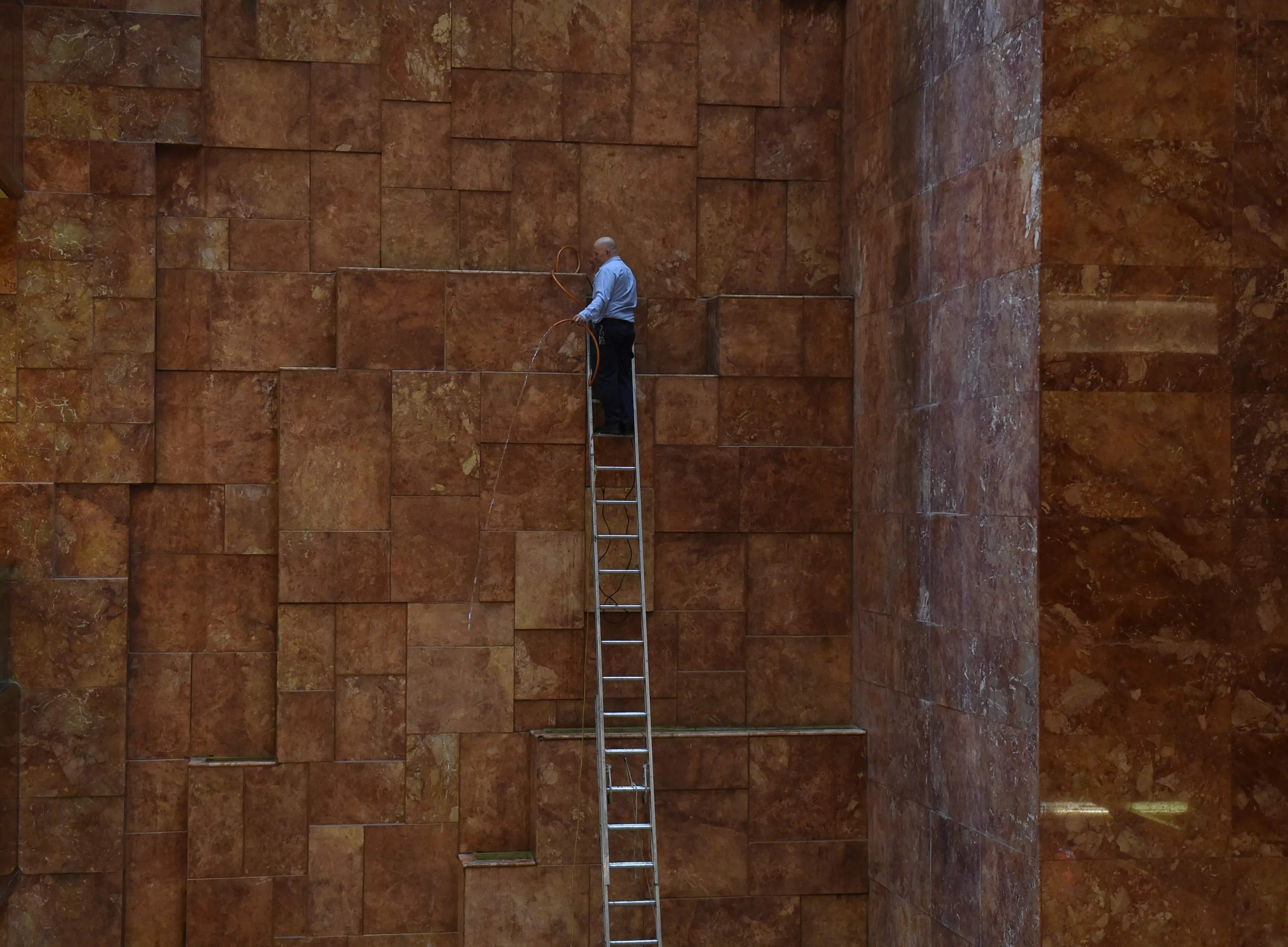 A Trump Tower worker cleans the waterfall at Trump Tower on another day of meetings scheduled for President- elect Donald Trump November 21, 2016 in New York. (Photo by Timothy A. Clary/AFP Photo)