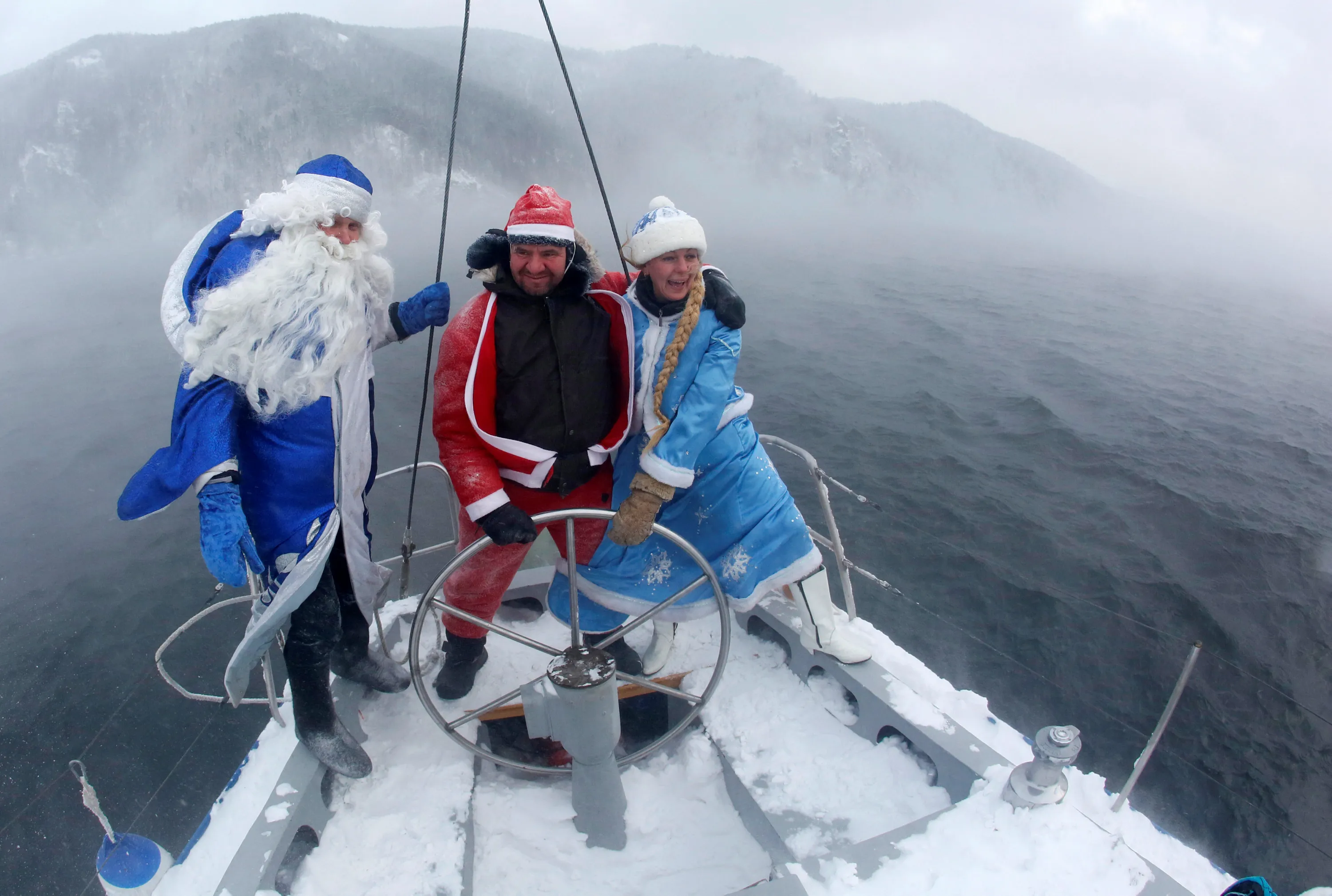 Members of the “Skipper” yacht club dressed as Santa Claus, its Russian equivalent Ded Moroz and his granddaughter Snegurochka (Snow Maiden) sail a yacht along the Yenisei River while marking the end of the sailboat season, with the air temperature at about minus 21 degrees Celsius (minus 5.8 degrees Fahrenheit), outside the Siberian city of Krasnoyarsk, Russia, November 21, 2016. (Photo by Ilya Naymushin/Reuters)