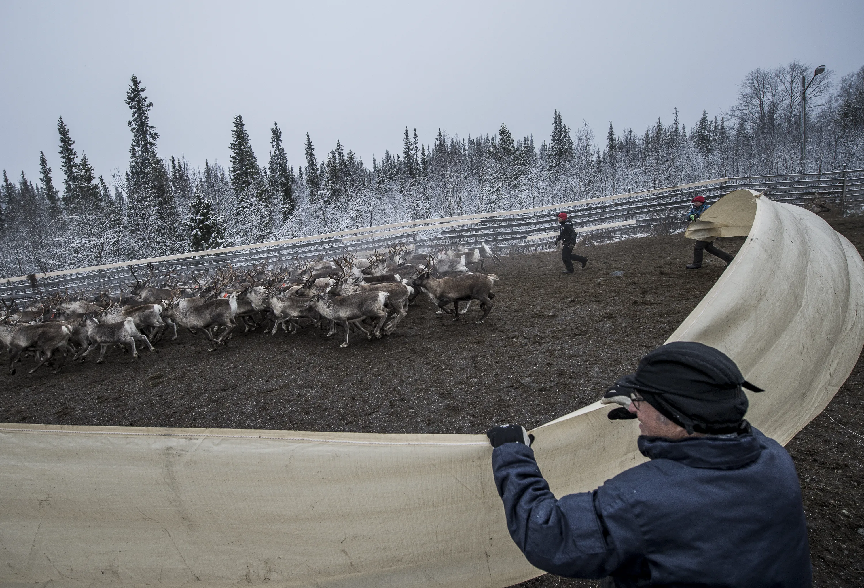 Sami people from the Vilhelmina Norra Sameby, gather their reindeers herd in a corral for selection and calf labelling on October 27, 2016 near the village of Dikanaess, about 800 kilometers north-west of the capital Sweden. (Photo by Jonathan Nackstrand/AFP Photo)