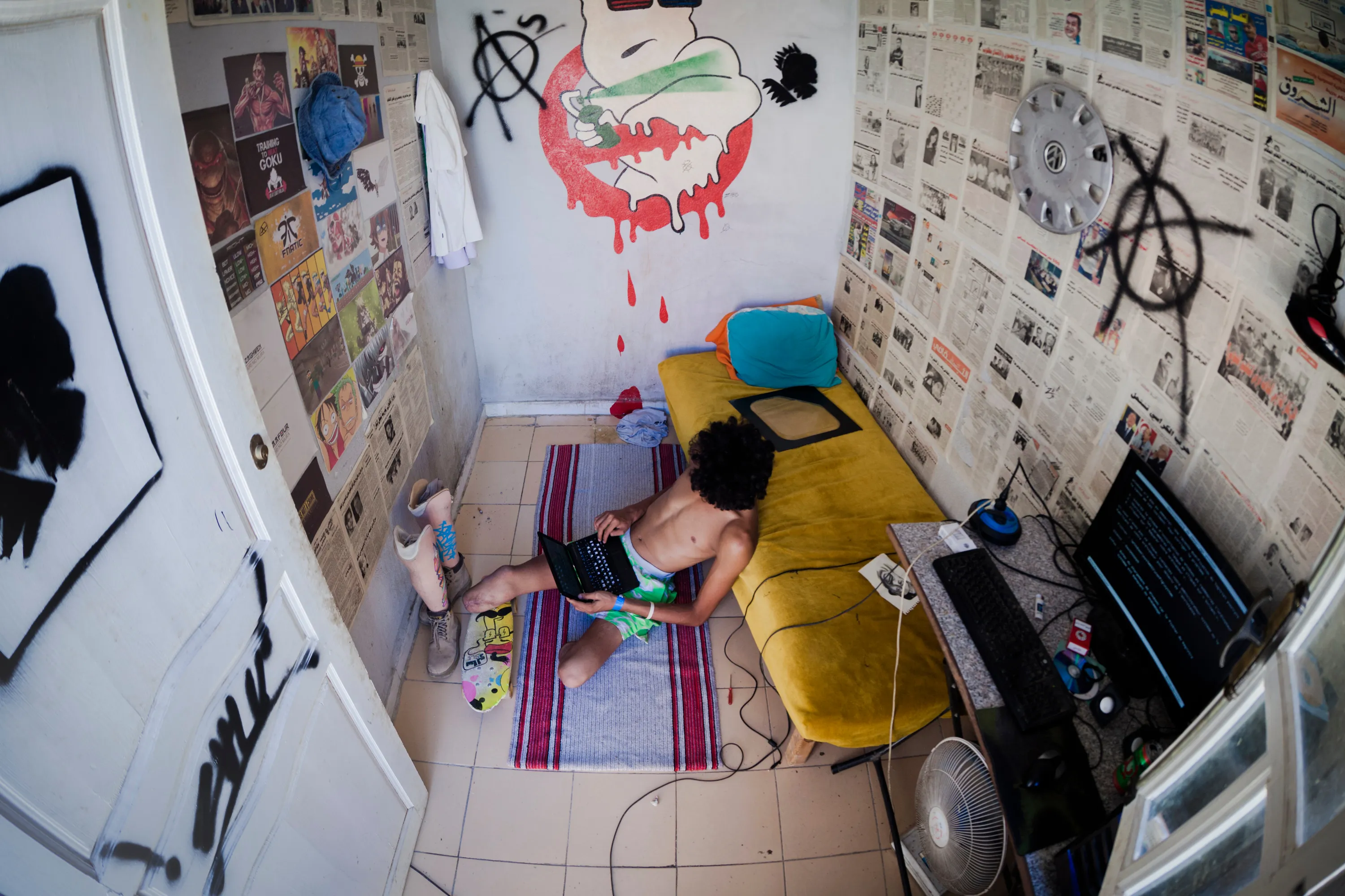 Guesmi in his self-decorated bedroom. After his accident, he told writer Tebourski Hosn: “I was doing nothing all the time and I couldn’t bear it so I decided to join a football team but it didn’t go well – in fact, I wasn’t really welcomed – so I quit”. (Photo by Yassine Alaoui Ismaili/The Guardian)