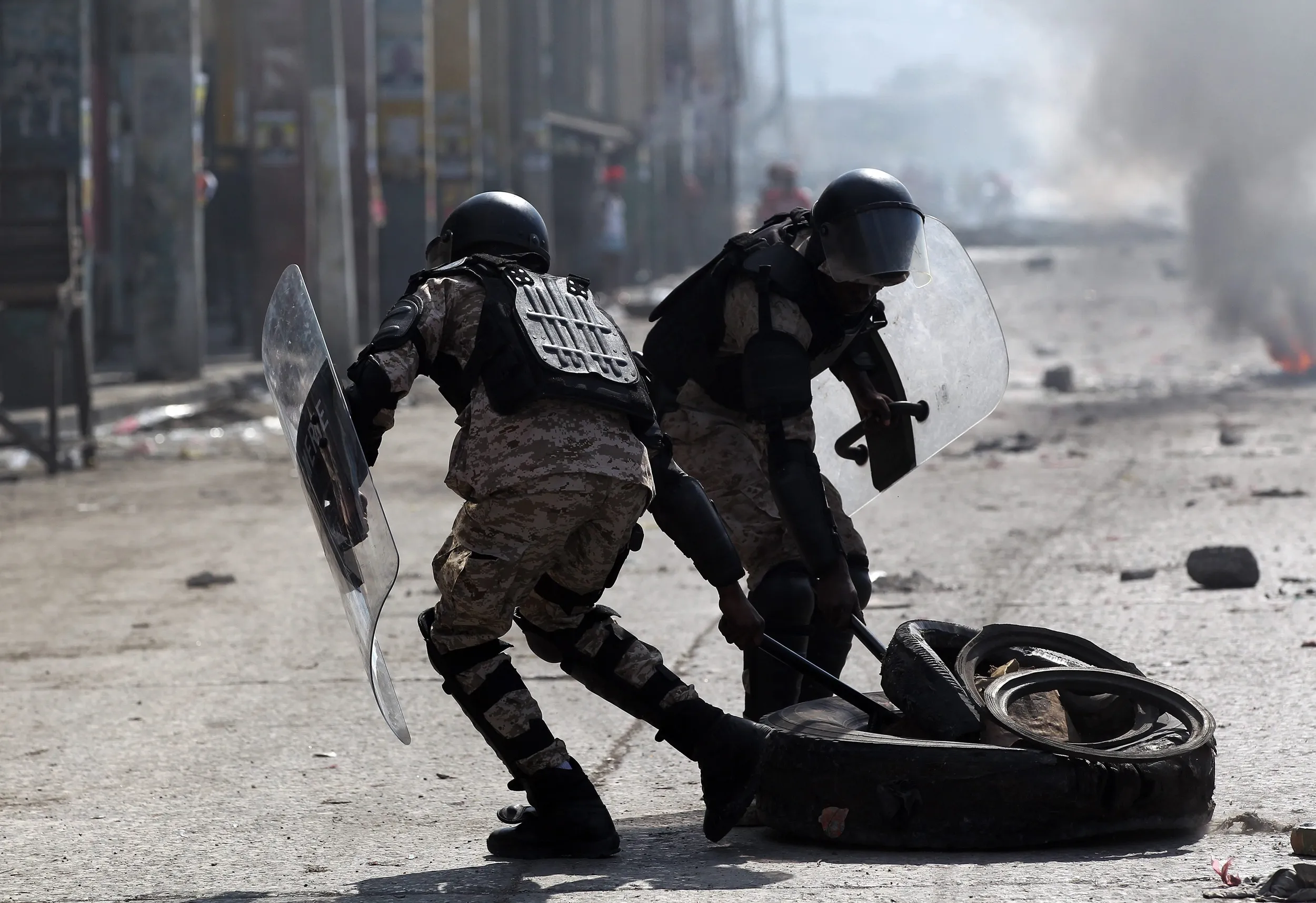 Policemen remove tyres from a street as supporters of the the Lavalas party presidential candidate Marise Narcisse demonstrate in Port-au-Prince, Haiti, 22 November 2016, two days after the general elections in the country. Official results are not expected until 28 November. (Photo by Alejandro Ernesto/EPA)