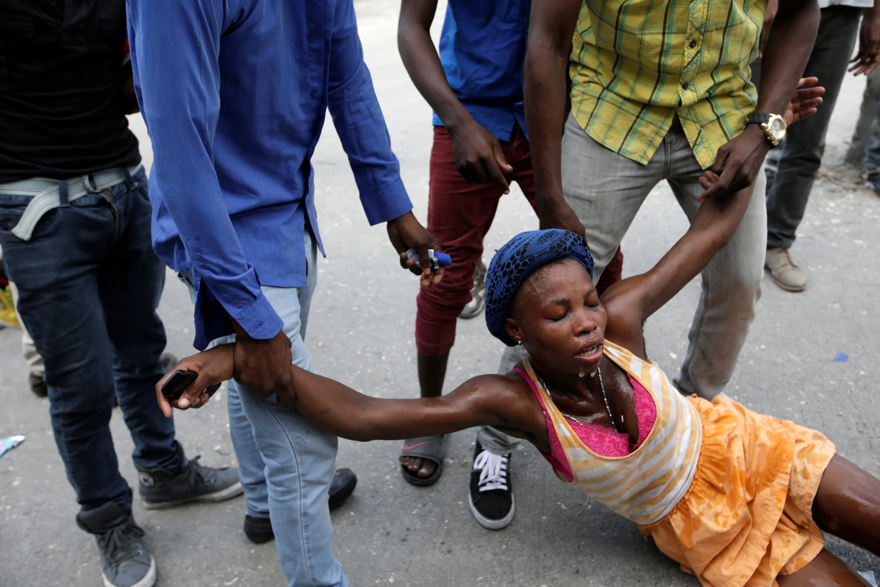 Men help a woman affected by tear gas used by National Police officers to disperse a demonstration of supporters of Fanmi Lavalas political party in the streets of Port-au-Prince, Haiti, November 22, 2016. (Photo by Andres Martinez Casares/Reuters)