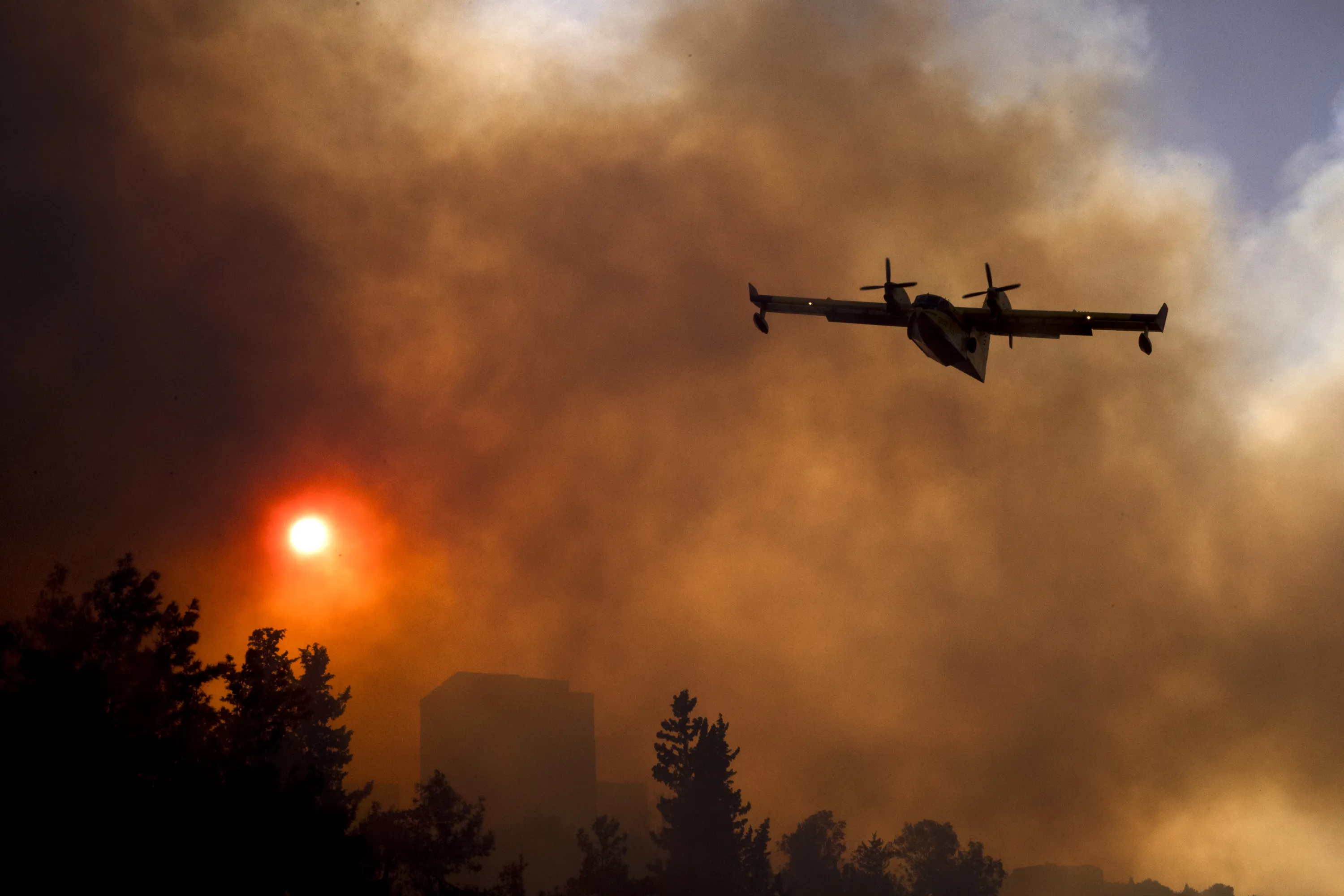 An Israeli firefighter plane helps extinguish a fire in the northern Israeli port city of Haifa on November 24, 2016. Hundreds of Israelis fled their homes on the outskirts of the country's third city Haifa with others trapped inside as firefighters struggled to control raging bushfires, officials said. (Photo by Jack Guez/AFP Photo)