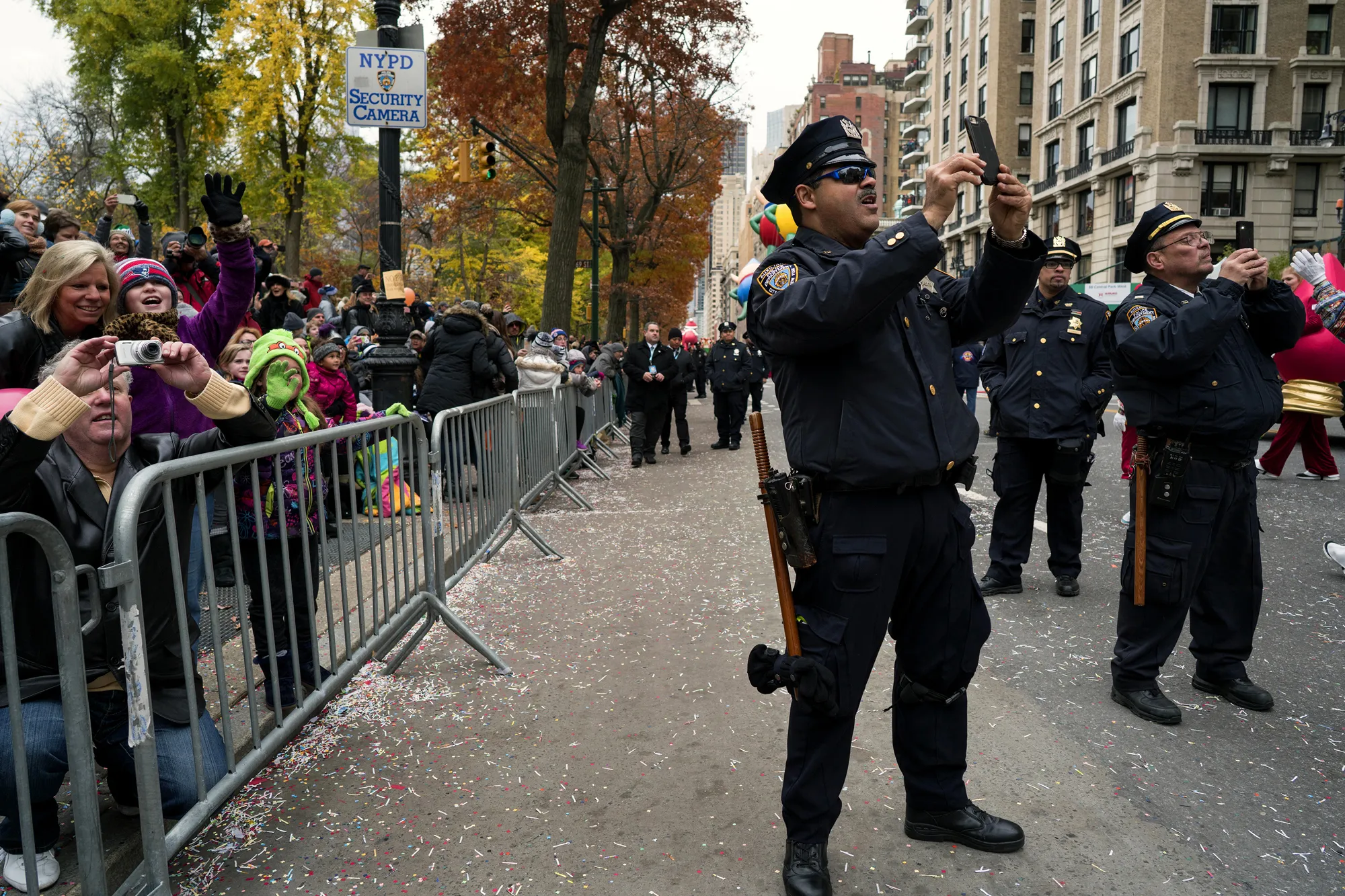 New York City police officers join spectators taking pictures as a float carrying Santa Claus passes by during the Macy's Thanksgiving Day Parade in New York Thursday, November 24, 2016. (Photo by Craig Ruttle/AP Photo)