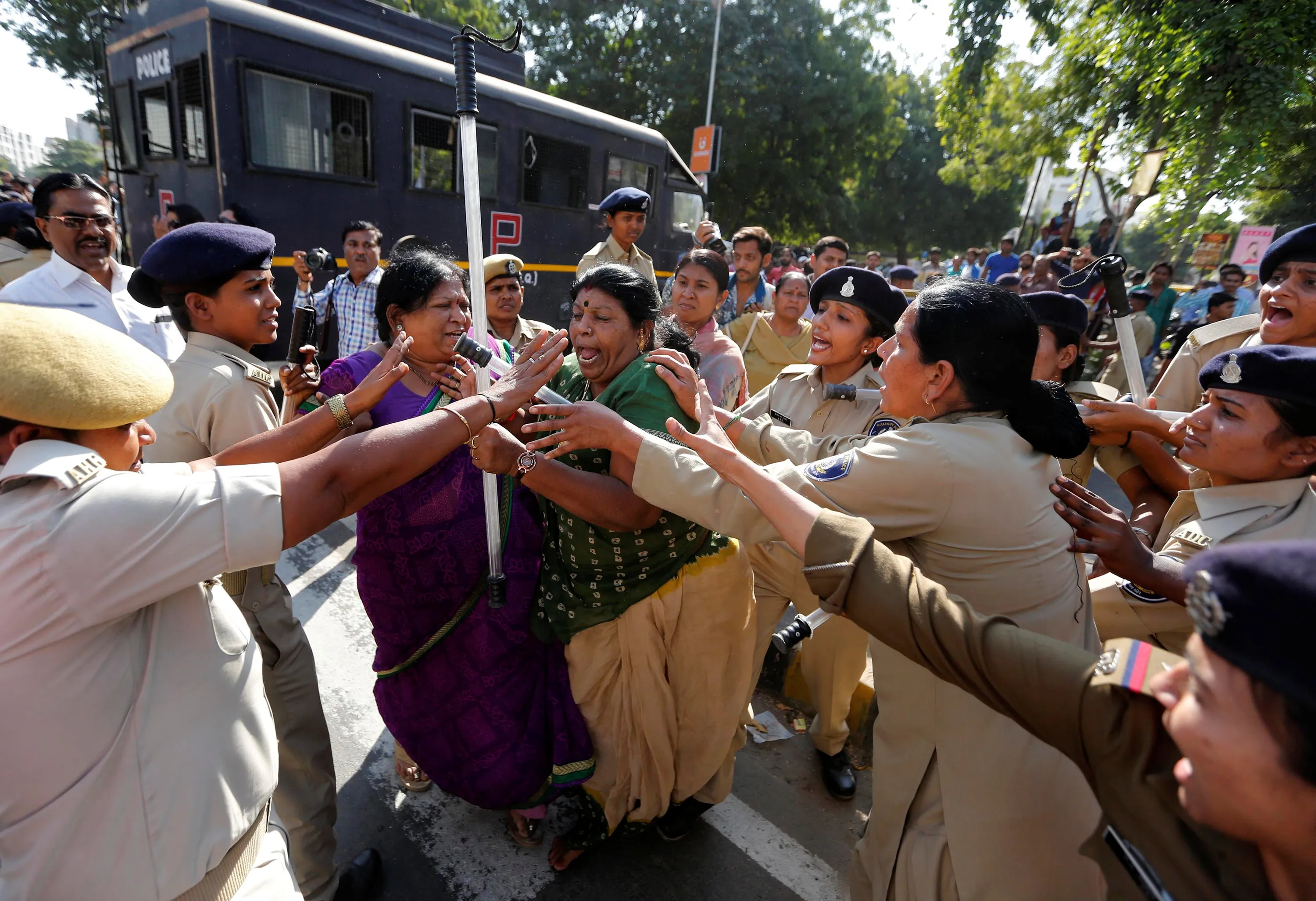 Supporters of India's main opposition Congress party scuffle with the police as they protest against the government's decision to withdraw 500 and 1000 Indian rupee banknotes from circulation in Ahmedabad, India, November 24, 2016. (Photo by Amit Dave/Reuters)