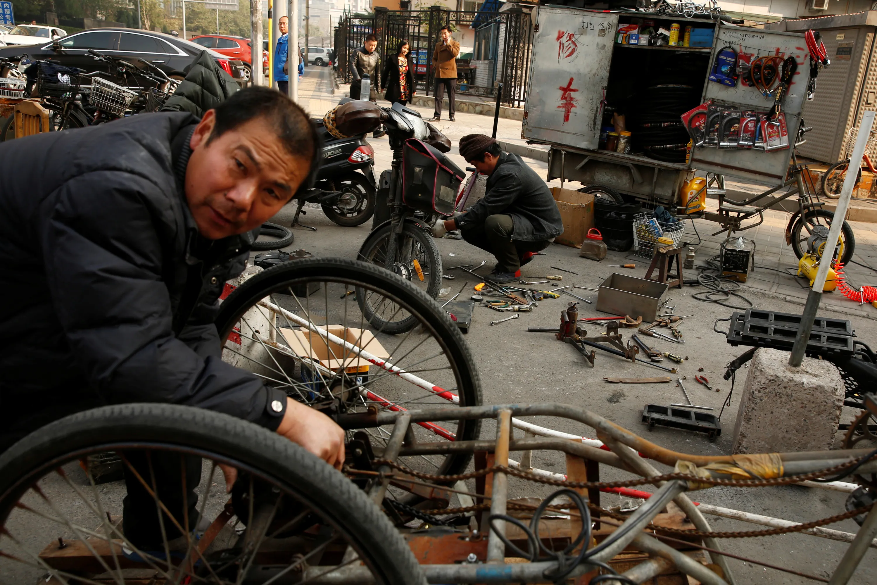 A man repairs a three-wheeled vehicle (foreground) typically used by garbage collectors at a pop-up repair shop on a pavement in Beijing, China, November 3, 2016. (Photo by Thomas Peter/Reuters)